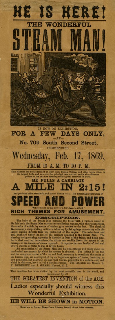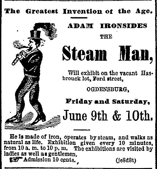 扎多克·戴德里克是新泽西州纽瓦克的一名机械师。22岁时的他提出了一个新颖的想法,即建造一个应该从永动机中获得活力的人。这一想法基于众所周知的机械原理,即如果将重物放在稍微垂直倾斜的立柱顶部,重力将倾向于产生水平和垂直运动。他与艾萨克·格拉斯合作开发了一种独特的蒸汽车,可以用一个男人般的身躯来拉动马车。在永动机没有成为现实后,蒸汽动力为了一种更实用、更可行的动力源。因为是在新泽西州纽瓦克制造的,所以人们也将其称为纽瓦克蒸汽人。虽然从技术上讲,蒸汽人不是机器人,但类似人类的设计和概念为未来的机器人技术铺平了道路。