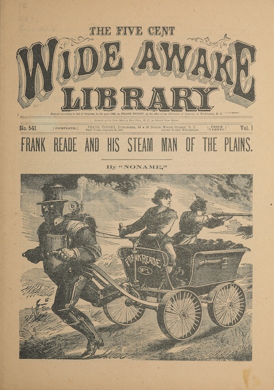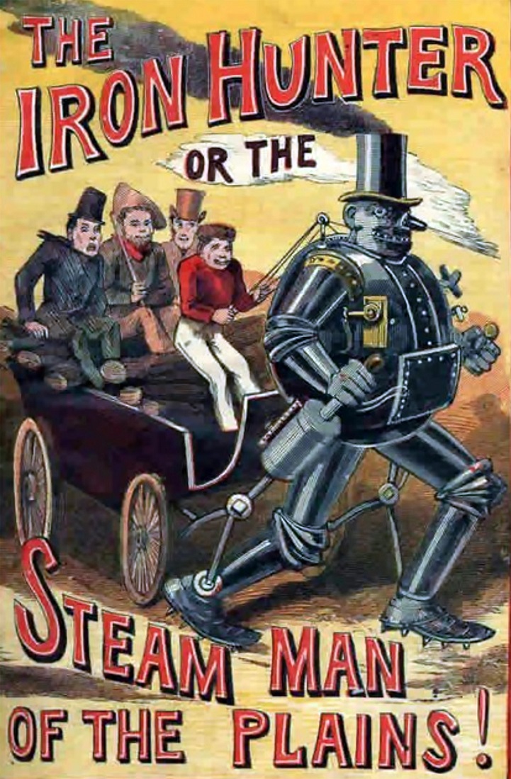 在戴德里克展出纽瓦克蒸汽人的众多观众中,有一个叫作爱德华·S.埃利斯的人,他是一名教师、学校行政人员、记者,也是一名成功的作家,出版了数百本书籍和众多杂志文章,其中不乏廉价的“一角钱小说”。埃利斯受到戴德里克想象力的感染和启发,将纽瓦克蒸汽人从现实的窘迫处境,带入了无所不能的想象世界。