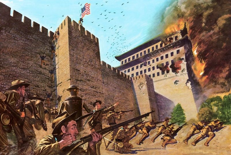 1900年8月14日,锅炉板与美国陆军第14步兵部队在东直门附近的北京城墙上。