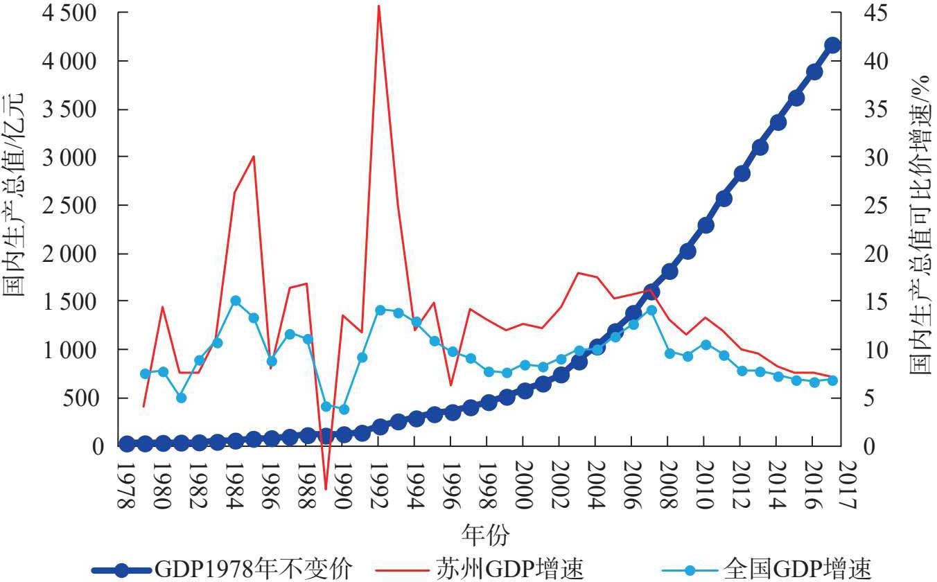 改革开放以来,苏州经济快速增长,2017年全市实现地区生产总值1.73万亿元,按可比价计算比上年增长7.1%。2017年,城市经济总量高于云南、内蒙古、黑龙江、山西、吉林、贵州、新疆、甘肃、海南、宁夏、青海、西藏12个省、自治区。2000年以来,苏州经济增长呈现出两个阶段性特征:2002年进入WTO(世界贸易组织)之后,国内生产总值以逐年10%以上的速度加速增长;2008年金融危机之后,国内生产总值增速逐年放缓。2010年国内生产总值增速高于全国平均水平2.7个百分点,2017年高于全国0.2个百分点(见图2-1)。