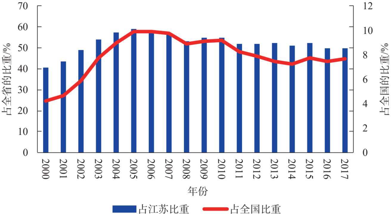 苏州对外贸易总额不管是在全省还是全国,都具有相对显著的贸易地位。苏州对外贸易总额占江苏省的比重由2000年的40.79%快速提升到2005年的58.95%,之后缓慢下降维持在50%左右;占全国的比重由2006年的9.89%下降到2017年的7.69%(见图2-5)。