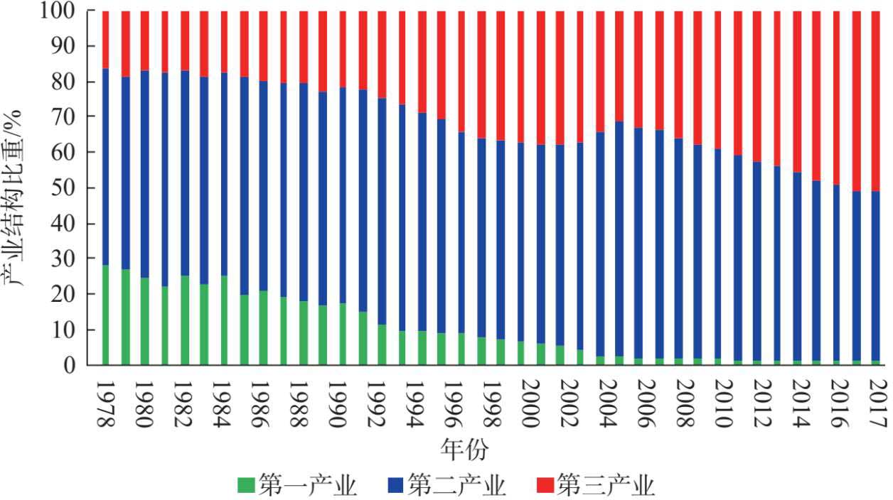 苏州的产业结构演进规律可以大致分为以下阶段:1978—1985年,“二一三”产业结构,以第二产业为主导,第一产业逐步降低,第三产业缓慢增长。1986—1990年,产业结构由“二一三”转变为“二三一”,以第二产业为主导,第一产业逐步降低,第三产业缓慢增长。1991—1995年,“二三一”产业结构,以第二产业为主导,第一产业迅速降低(由17.3%下降到8.9%),第三产业加速增长(由21.7%增长到30.9%)。1996—2000年,“二三一”产业结构,以第二产业为主导。2001—2005年,“二三一”产业结构,以第二产业为主导,第一产业逐步降低;但是第二产业的主导作用持续强化(工业比重由51.3%增长到61.1%),第三产业发展空间受限(由37.6%下降到33.1%)。2006—2010年,“二三一”产业结构,第二产业为主导;第二产业主导地位逐步弱化,第三产业快速增长(由33.6%增长到41.1%)。2011—2015年,“二三一”产业结构,第二产业和第三产业共同主导;“十二五”末期,工业比重已经低于第三产业比重,呈现出由“二三一”转变为“三二一”的趋势。2016—2017年,产业结构由“二三一”转变为“三二一”,第三产业和第二产业共同主导(见图2-9)。