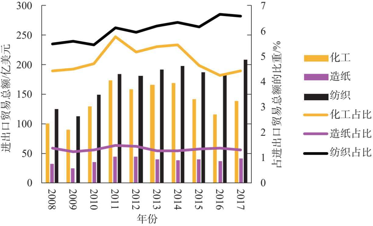 尽管机电产品和高新技术产品占进出口贸易总额的很大比重,但是以纺织、化工和造纸为代表的高耗能产品占进出口贸易总额的比重由2008年的11.29%增长到2017年的12.29%。尤其是纺织产品的进出口贸易总额总体上处于不断增长趋势,由2008年的125.34亿美元增长到2017年的207.91亿美元,占苏州进出口贸易总额的比重由2008年的5.48%增长到2017年的6.58%(见图2-7)。