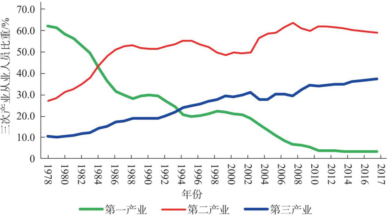 苏州第二产业就业比重由1978年的27.1%迅速提升到1984年的43.4%,使苏州的就业结构从“一二三”演变为“二一三”。之后,苏州第一产业就业比重持续降低,第三产业就业比重持续增长,1994年第三产业就业比重为24.2%,超过第一产业的20.5%,苏州的就业结构由“二一三”演变为当前的“二三一”。虽然近年来第三产业就业比重持续上升,第二产业就业比重有所下降,但是第二产业就业比重仍然保持在60%左右,2017年第二产业就业比重为59.1%,第三产业就业比重为37.6%(见图2-11)。