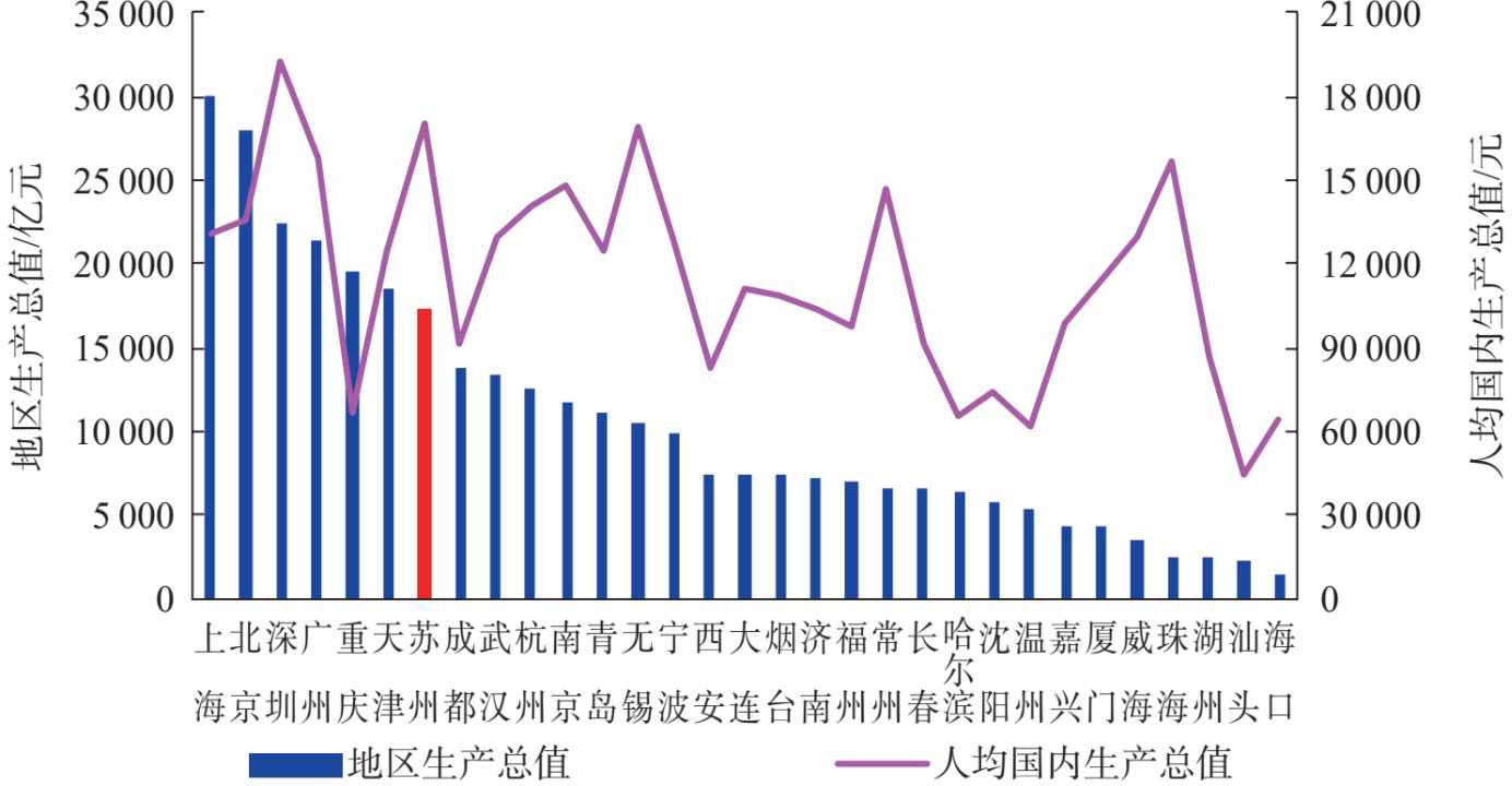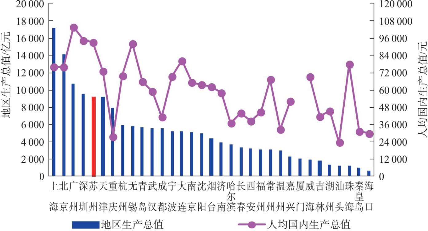 随后的近十年间,2011年,天津实现国内生产总值11 190.99亿元,超越苏州的同期国内生产总值10 716.99亿元,苏州位居全国城市国内生产总值第六位;2014年,重庆实现国内生产总值14 265.4亿元,超越苏州的同期国内生产总值13 760.89亿元,苏州位居全国城市国内生产总值第七位。2017年,苏州实现国内生产总值17 319.51亿元,落后于上海(30 133.86亿元)、北京(28 000.4亿元)、深圳(22 438.39亿元)、广州(21 503.15亿元)、重庆(19 500.27亿元)和天津(18 595.38亿元),位居全国城市国内生产总值第七位;但是,常住人口人均国内生产总值为162 388元,仅低于深圳(183 127元)(见图2-3)。