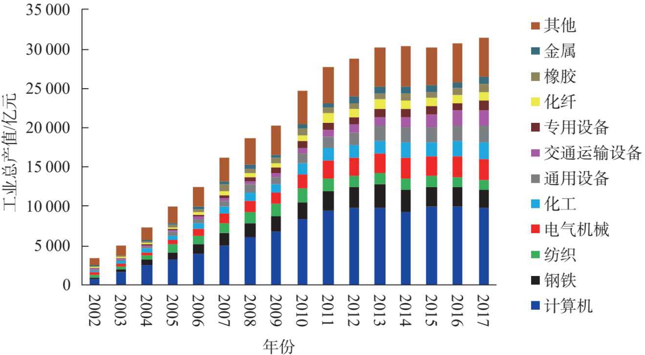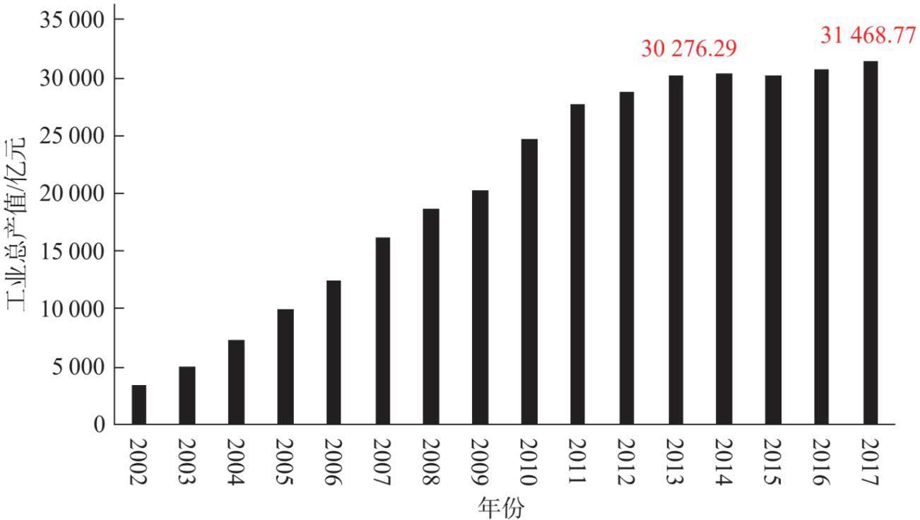苏州产业结构升级相对缓慢的最主要原因,是苏州的城市工业经济规模巨大。作为当前江苏省工业第一大市,共有工业企业15万余家,其中规模以上企业近万家,工业产值超百亿元企业32家,拥有世界500强企业2家(沙钢集团、恒力集团)。2017年,规模以上工业总产值实现31 468.77亿元,规模以上工业总产值连续6年跻身“3万亿俱乐部”,仅次于上海,位居全国第二工业大市(见图2-10)。此外,苏州市制造业的重型化特征较为明显,2017年规模以上重工业总产值占工业总产值的比重为76.07%,远远高于2002年的55.44%。