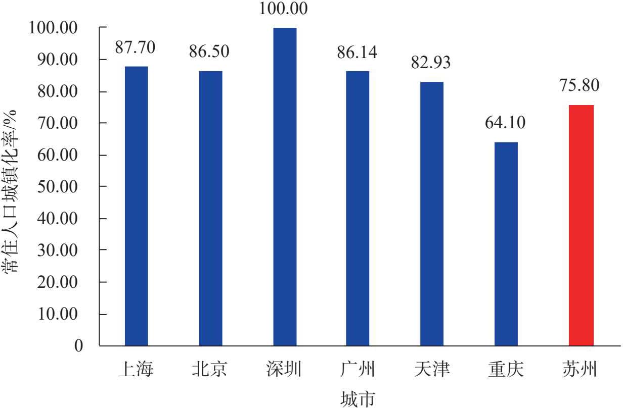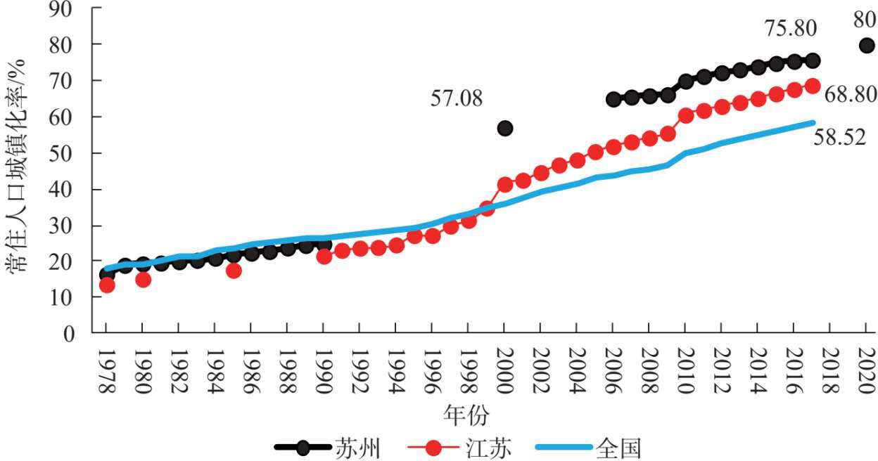 20世纪90年代,苏州外向型经济的快速发展推动开发区建设,推动中心城市规模扩张,并通过撤乡并镇,建设乡镇开发区,推动中心镇的快速发展,其间苏州工业园区、昆山经济技术开发区等国家级经济开发区的建设促进了新兴产业的快速集聚,形成了以中心城市为主的结构合理、功能互补、均衡协调的城镇体系。进入21世纪,苏州经济社会发展进入了一个新的阶段,苏州被国家发展改革委批复为城乡一体化综合改革试点,这对于苏州来讲是一次重大的发展机遇,科学发展和转型发展加快了苏州城乡一体化的进程,实施“双基点”城镇化战略(即以中心城市和4个副中心城市为主的功能性城镇化战略和以50个镇为主的就地城镇化战略),使苏州进入了以城乡一体化为主的都市化阶段。2017年苏州常住人口城镇化率为75.80%,高于江苏省的68.80%和全国的58.52%。但是,低城镇化与高工业化并存,造成隐性城镇化