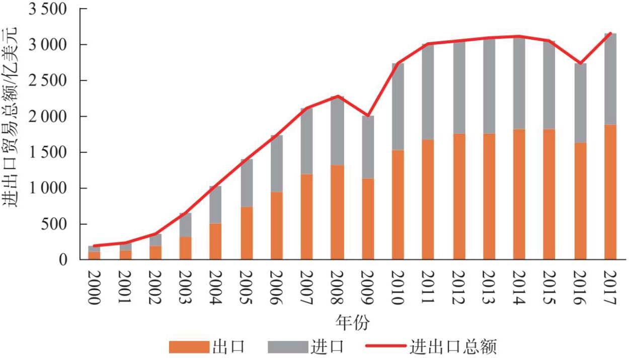 开放型经济是苏州经济发展模式的显著特征之一,对外贸易稳定增长。2000年以来,中国加入WTO,苏州进出口贸易总额快速增长;2010年之后,全球经济依然处于后金融危机时代的恢复期,进出口贸易总额增长缓慢。2017年,苏州实现进出口总额3 160.79亿美元,比上年增长15.5%;对外贸易依然以出口为主,其中出口1 871.61亿美元,进口1 289.18亿美元;从贸易市场看,出口市场以美国和欧盟为主,同时,对“一带一路”沿线国家和地区出口382.8亿美元,占全市出口额比重提升至20.5%(见图2-4)。