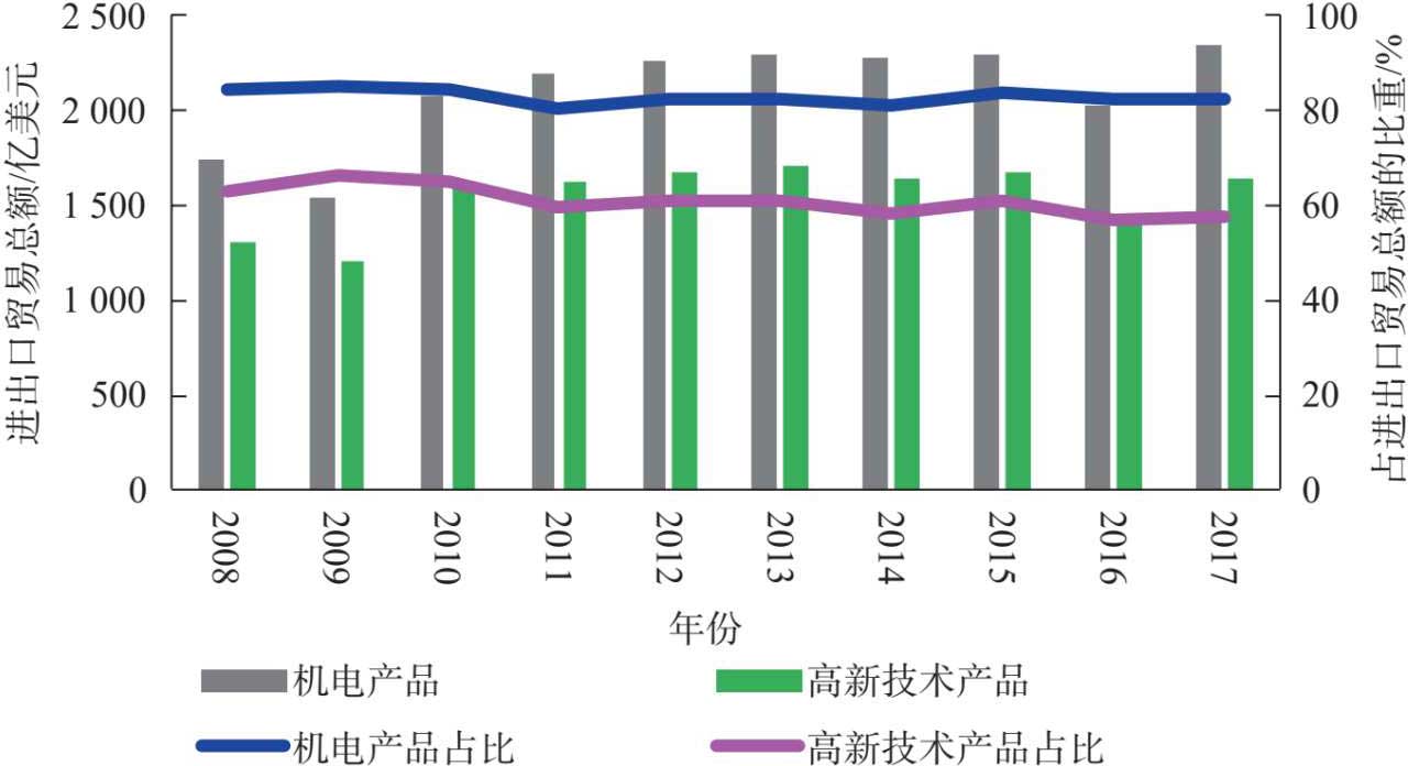 苏州的对外贸易产品以机电产品为主,2008年机电产品占进出口贸易总额的比重为76.07%,2017年机电产品占进出口贸易总额的比重为74.16%。2017年,机器、电子产品、电气设备及零件的进出口总额为1 935.76亿美元,其中出口额为1 190.29亿美元。苏州的高新技术产品占进出口贸易总额的比重为52.04%,但是高新技术产品总体增长趋势缓慢(见图2-6)。