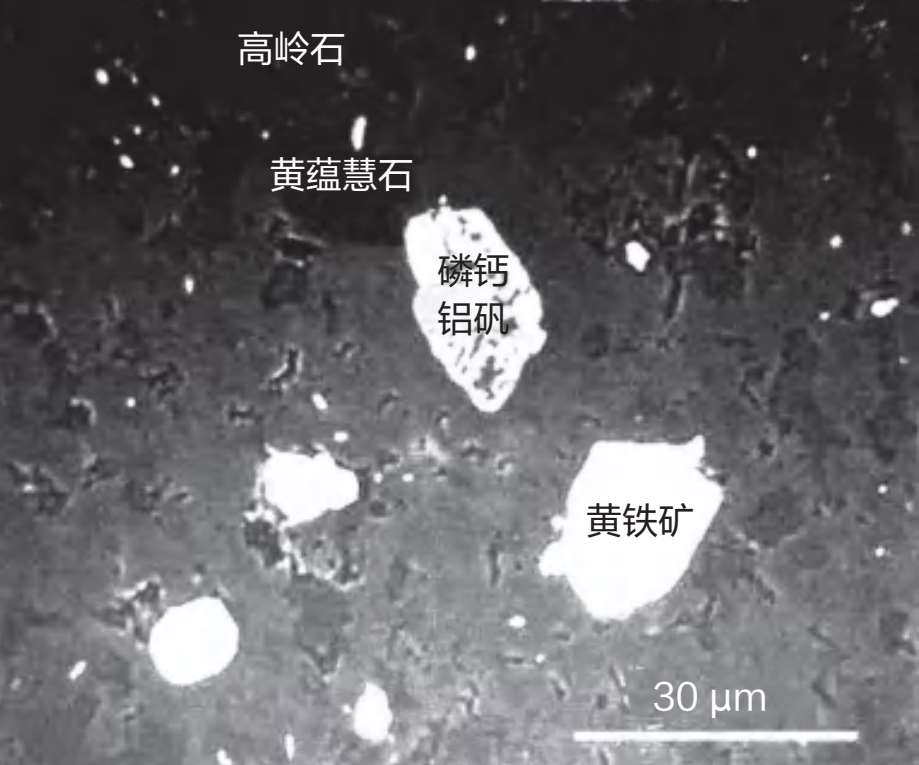 黄蕴慧石在显微镜下为自形和半自形晶体,直径一般为3~10μm,与高岭石和黄铁矿密切共生。直径达20μm的圆形集合体也较为常见,它们被相同大小的高岭石集合体环绕。在平行偏光下,有时也能观察到长达40~70μm的黄蕴慧石晶体,这些黄蕴慧石颗粒都有一个浑浊的内核,其厚度仅为3~8μm。经检测,黄蕴慧石的内核由磷钙铝矾[Woodhouseite,CaAl 3 (PO 4 )(SO 4 )(OH,H 2 O) 6 ]亚族的固溶体构成(图7-1) [1] 。