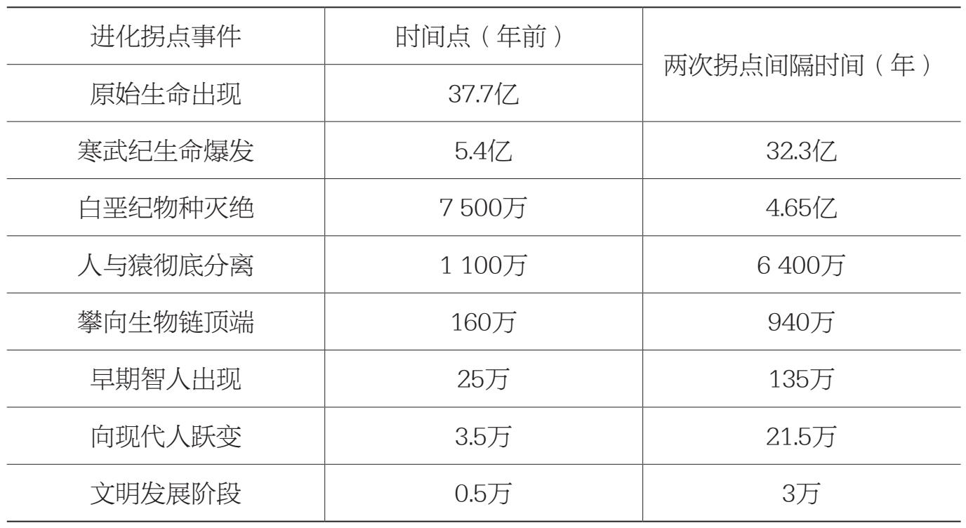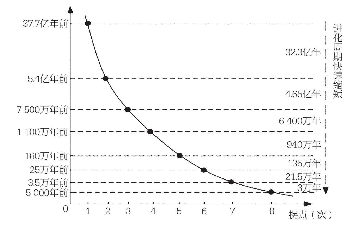 间断的生物化石证据,有可能让我们知道“是什么”。多年来的化石研究积累表明,地球生物在整体上呈现出“加速进化规律”,物种出现愈晚、愈高级,进化速度就愈快。例如,从原核生物进化到真核生物用了14亿年,从低等无脊椎动物进化到高等无脊椎动物用了1亿年,从软体动物进化到鱼类用了6000万年,从猿人进化到智人用了不到300万年,而人类文明的发展至今才只有几千年等 [15] 。对进化加速的原因我们不得而知,但从太古代到现代的漫长历程中,生物进化的许许多多节点是留下了化石痕迹的,分析这些时间节点或许能够看出加速进化规律的粗线条。尤其是进化史上一些重要的时间节点,比如寒武纪生命大爆发、人与猿的彻底分离等转折点,我们可以称之为“进化拐点”。这些拐点也许因年代久远而在时间上不精准,也可能由于对进化转折的理解不同而认可不一,但梳理“进化拐点”对找出整体进化规律却是有益的,值得做更多的尝试。这里不妨梳理一些“进化拐点”出来,看看能否构成一幅有规律可循的加速进化图景。