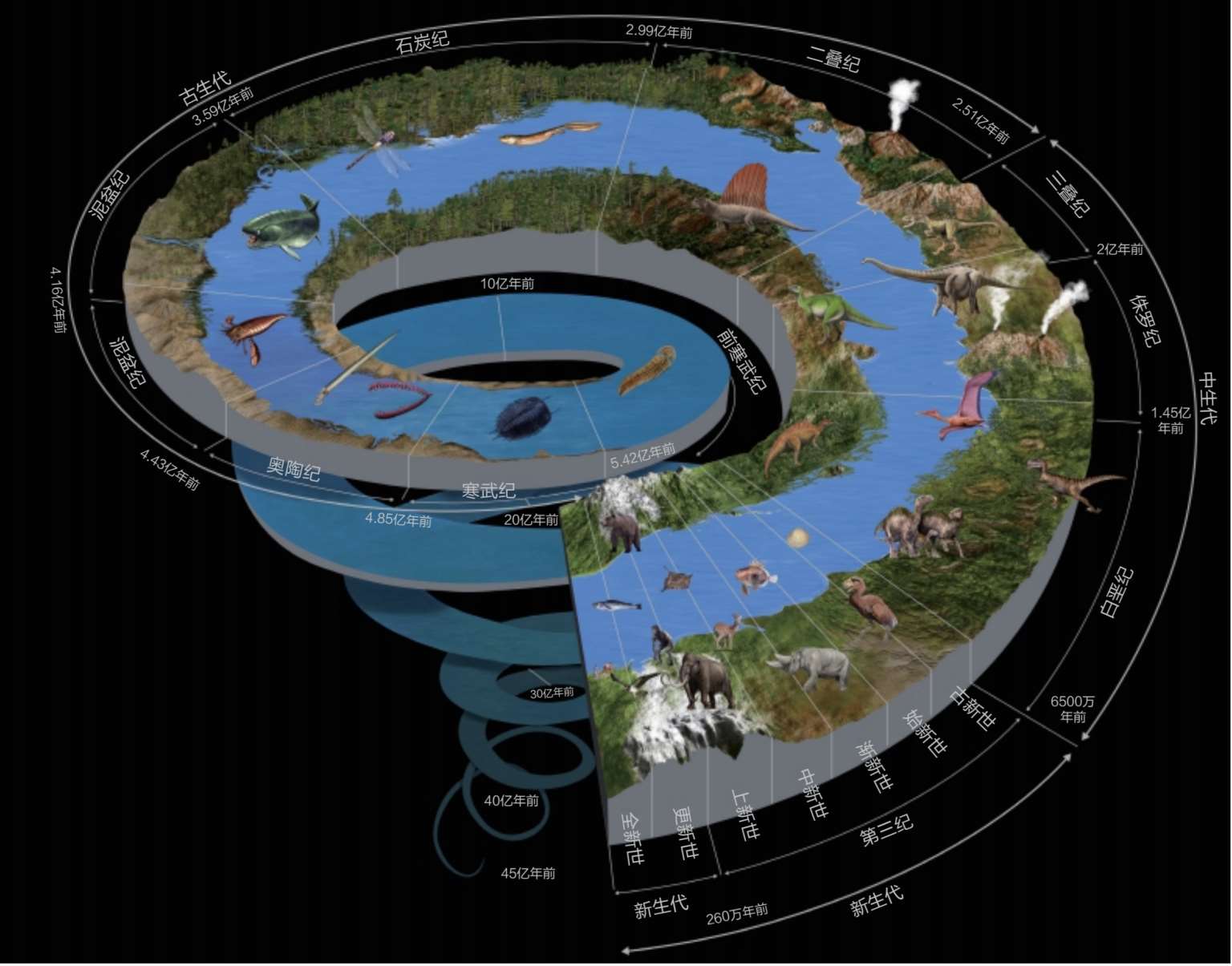 拐点之一 :太古宙出现了生命。把这第一个拐点称为“起点”也许更合适,因为在生命出现之前无所谓“进化拐点”。一般认为,地球在46亿年前形成以后,大约经过10亿年的冷却便出现了最原始的生命。但近年的考古发现,地球上生命出现的时间还要更早些。2016年澳大利亚地质学家在格陵兰岛发现了微生物菌席的化石,距今约有37亿年。紧接着,2017年英国伦敦大学两位博士在加拿大魁北克又发现了更早的管丝状微生物化石,距今至少也有37.7亿年 [16] ,这是已发现的地球生命最早的记录。