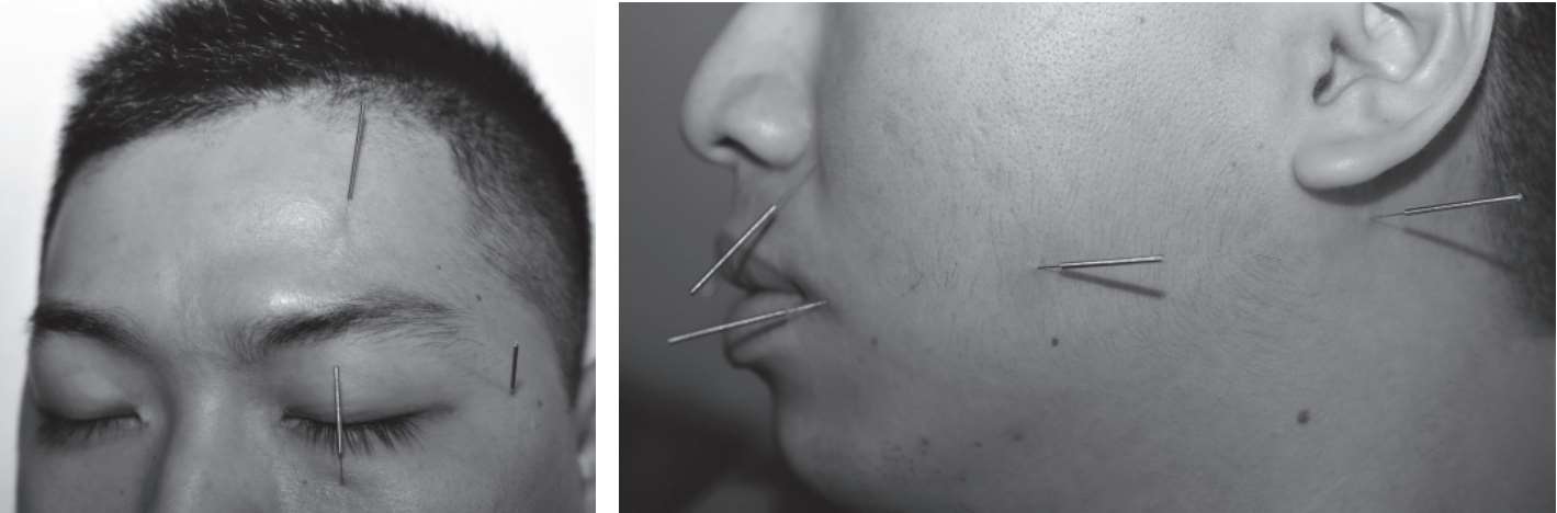 操作:用75%乙醇常规消毒针刺部位。选用30号一次性不锈钢针灸针。急性期先针刺双侧外关、合谷,行提插捻转泻法;然后针刺患侧翳风、迎香,针刺翳风前,先用食指在耳根后按压,一般情况下,面瘫患者在这个穴位都会有明显的压痛,力度不必太大,直刺,针刺深度以患者出现酸、麻、胀感为度,手法不要过重;再针刺地仓和颊车,针刺地仓和颊车时要注意方向和角度,两针相对而刺,地仓方向是针柄与口角线呈一条直线。眼睑闭合不全加太阳、阳白、四白,向下平刺阳白,四白、太阳两穴针刺方向均向下直刺;口角歪斜加迎香,沿鼻唇沟斜刺。以上穴位进针深度在0.8~1.5寸,在急性期均宜轻刺浅刺,不强求强烈针感。静止期及恢复期,先针刺双侧外关、健侧合谷,以平补平泻法行针;其他针刺穴位同急性期,但针刺宜深刺、重刺,要求有强烈针感,每次留针30分钟。每天治疗1次,每周针刺5次,1个月为1个疗程。