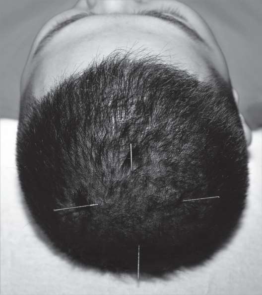 主穴:智三针(神庭及双侧本神),四神针(百会前后左右各旁开1.5寸,图2-6),颞三针(耳尖直上,发际上2寸为颞Ⅰ针,在颞Ⅰ针水平向前后各旁开1寸为颞Ⅱ针、颞Ⅲ针)。