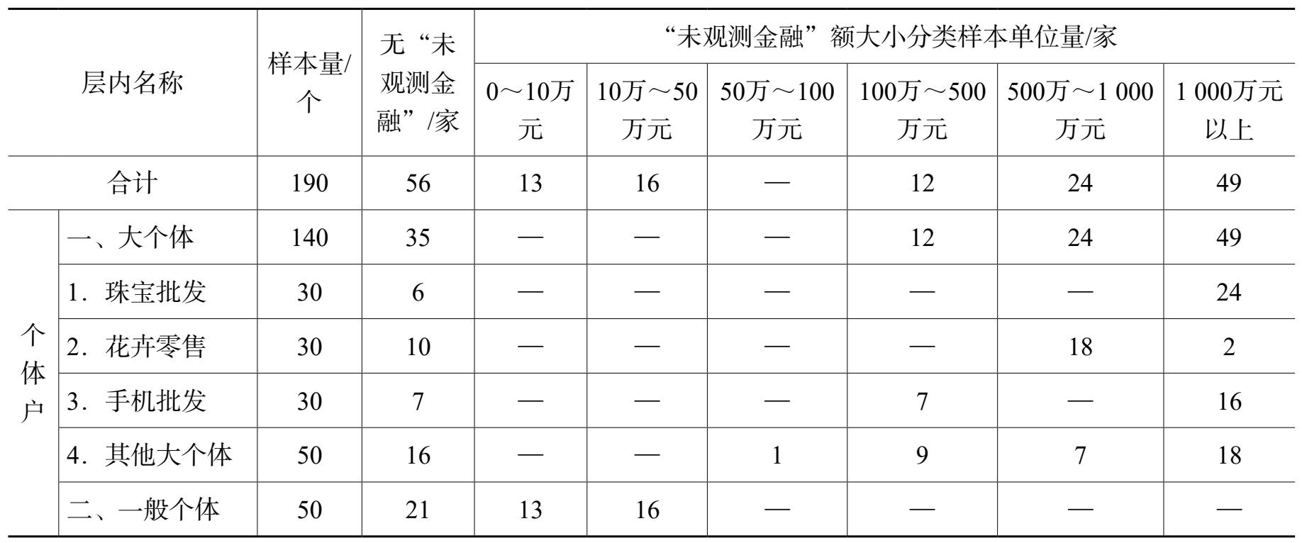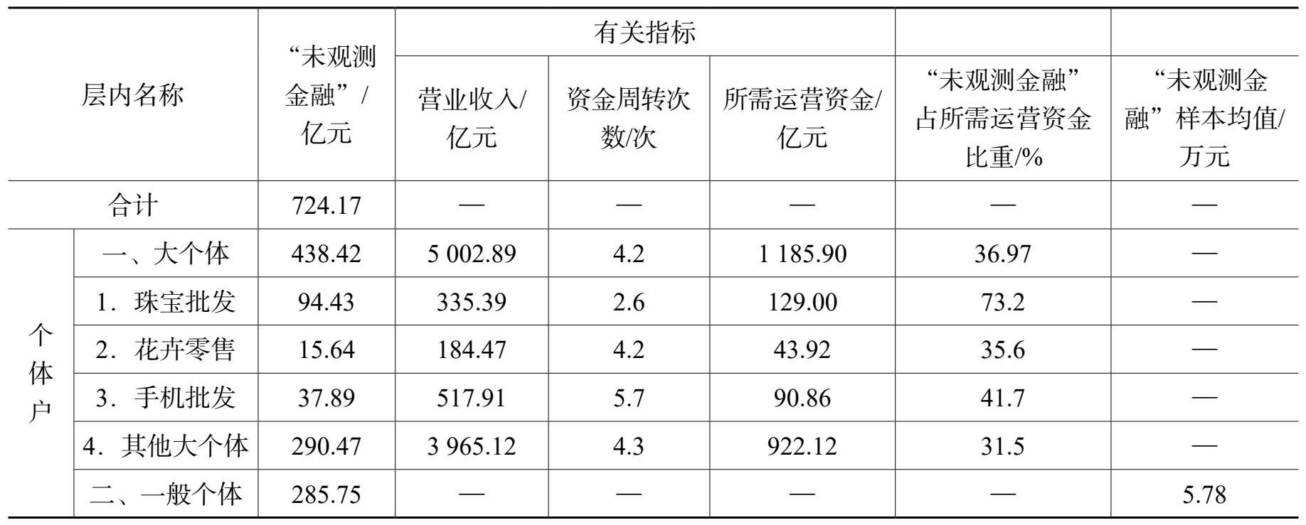 注:“大个体”层内“未观测金融”参数点估计等于营业收入总额÷资金周转次数ד未观测金融”占所需运营资金比重;“一般个体”层内“未观测金融”参数点估计等于“未观测金融”样本均值×总体单位数。