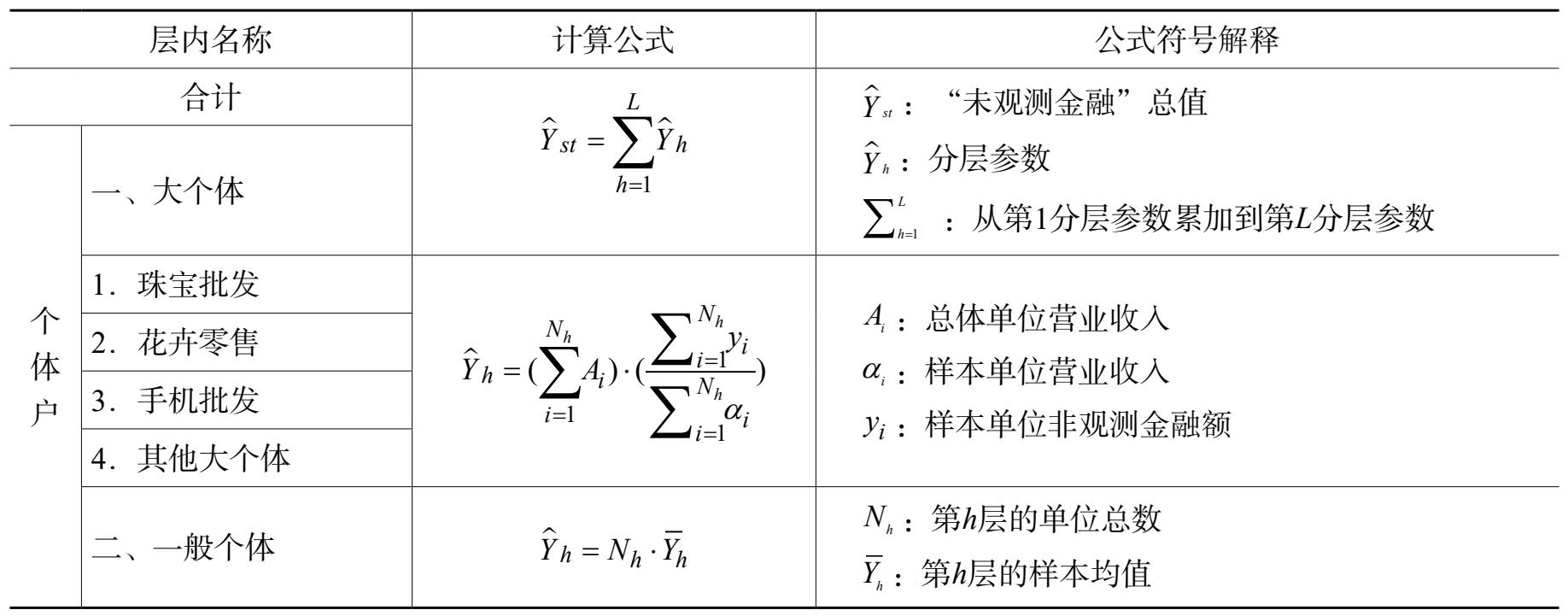 点估计。全市个体户“未观测金融”总量按点估计取得,使用“大个体”层和“一般个体”层参数相加后数据。具体的计算公式见表3。