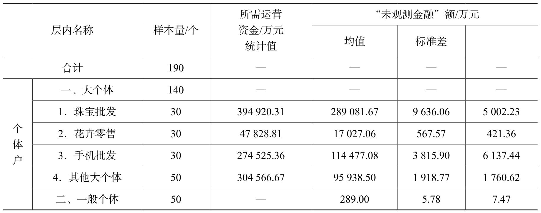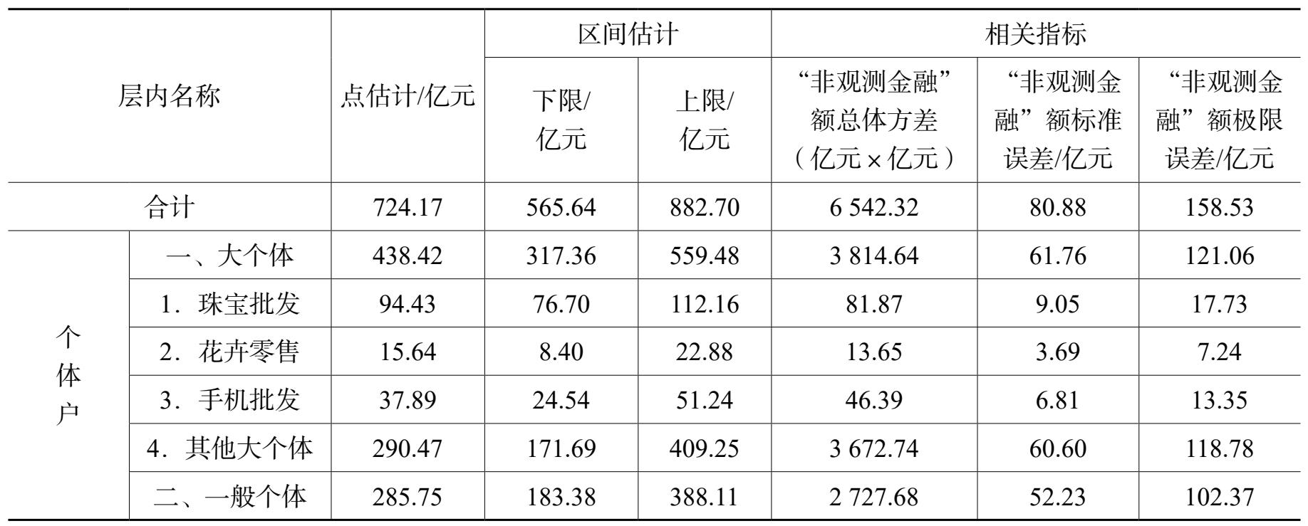 注:“大个体”层内“未观测金融”参数点估计等于营业收入总额÷资金周转次数ד未观测金融”占所需运营资金比重;“一般个体”层内“未观测金融”参数点估计等于“未观测金融”样本均值×总体单位数。