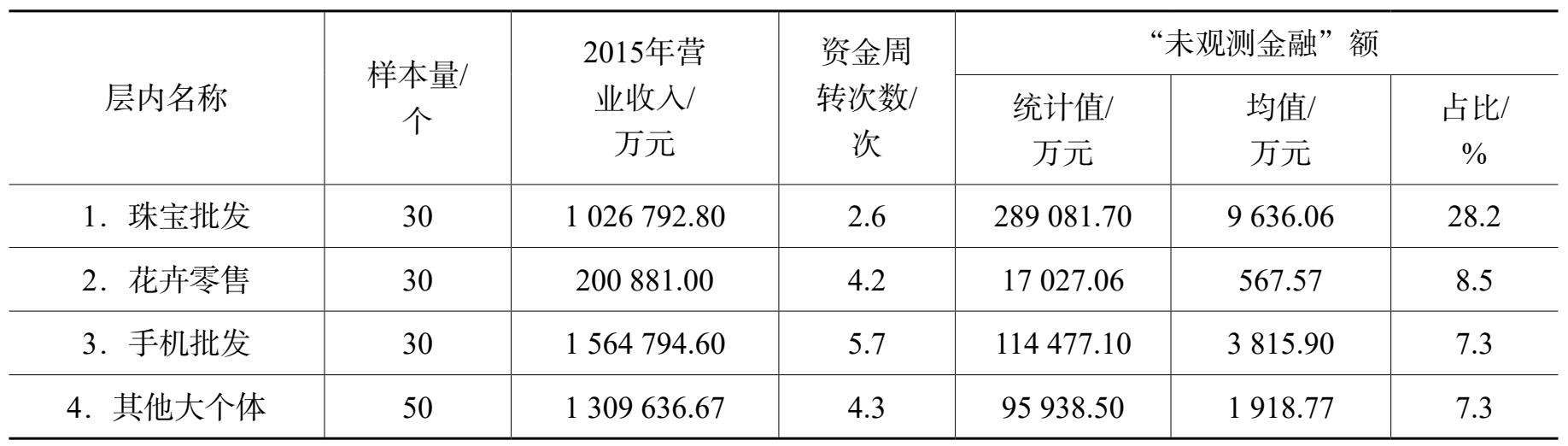 “黄金珠宝”层的周转次数虽然最少,为2.6次,但“未观测金融”占所需运营资金比重最大(73.2%),通过2015年30个样本单位的营业收入(102.68亿元)计算出的“未观测金融”为28.91亿元,占营业收入的28.2%。经过加权计算“未观测金融”占营业收入抽样调查统计量见表7。