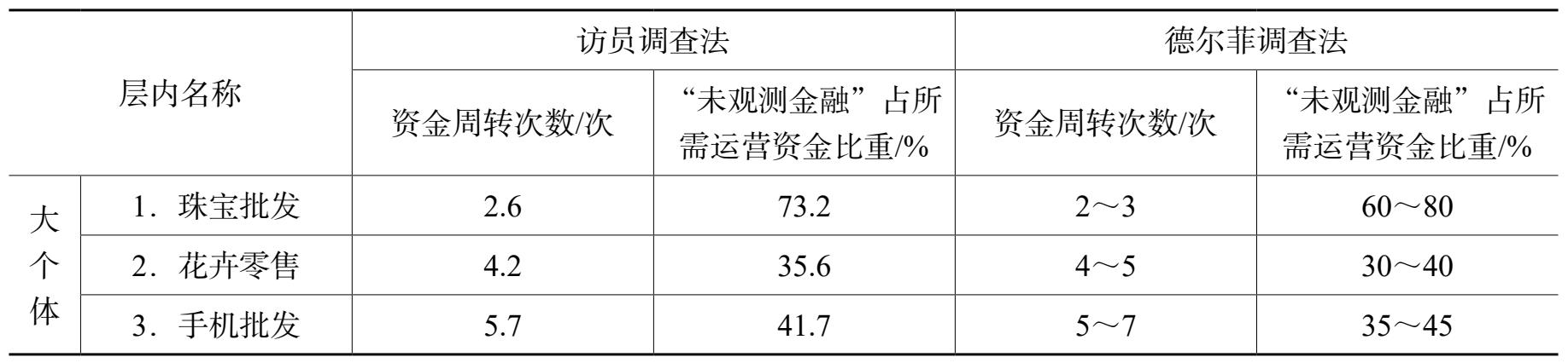 对“大个体”样本,三人一组进行面访调查:先由市场管理人员进行联系、介绍,打消被调查者的顾虑;接着由访问员讲解调查目的、抽取样本的方法、被抽中样本真实性回答对代表性的意义、调查资料的使用范围和保密性的原则,获得认可后详细询问周转次数、资金使用量和“未观测金融”所占比重等主要指标;行业协会工作人员在旁判断其可信程度。