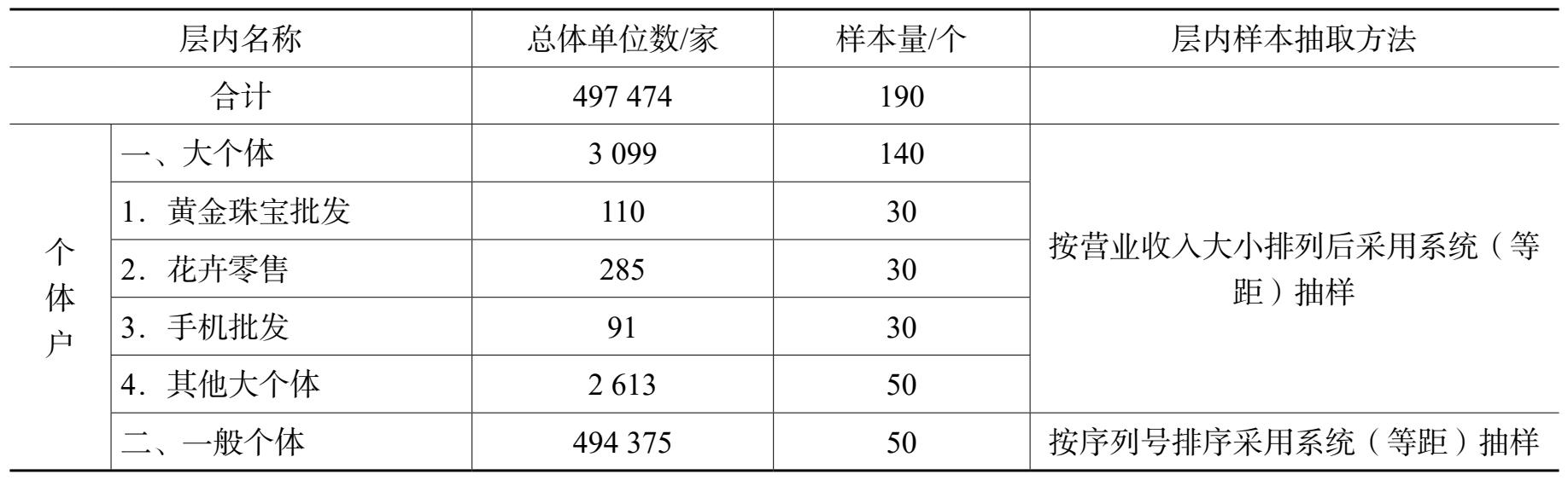 在“大个体”的“黄金珠宝批发”“花卉零售”“手机批发”和“其他大个体”各层中,各总体单位按营业收入大小排列后采用系统(等距)抽样抽出样本;“一般个体”按序列号排序采用系统抽样抽出样本。有关层总体单位数和样本量见表2。