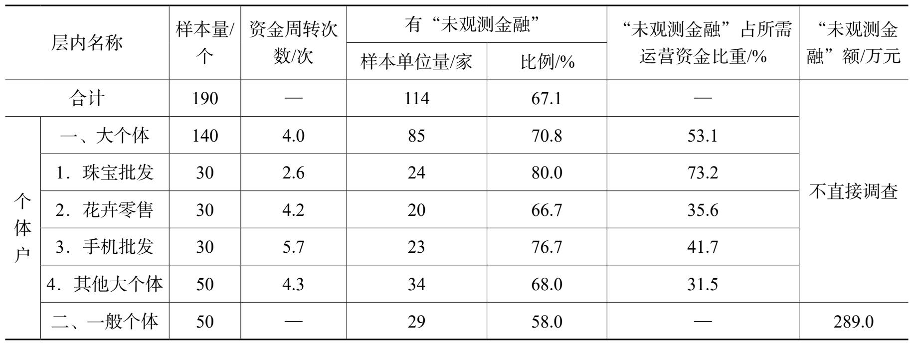 成立“未观测金融”调查小组,由调查访问员、个体户所在市场管理人员和熟悉情况的行业协会工作人员组成。“未观测金融”的样本量有190家,其中,大个体140家,一般个体50家。