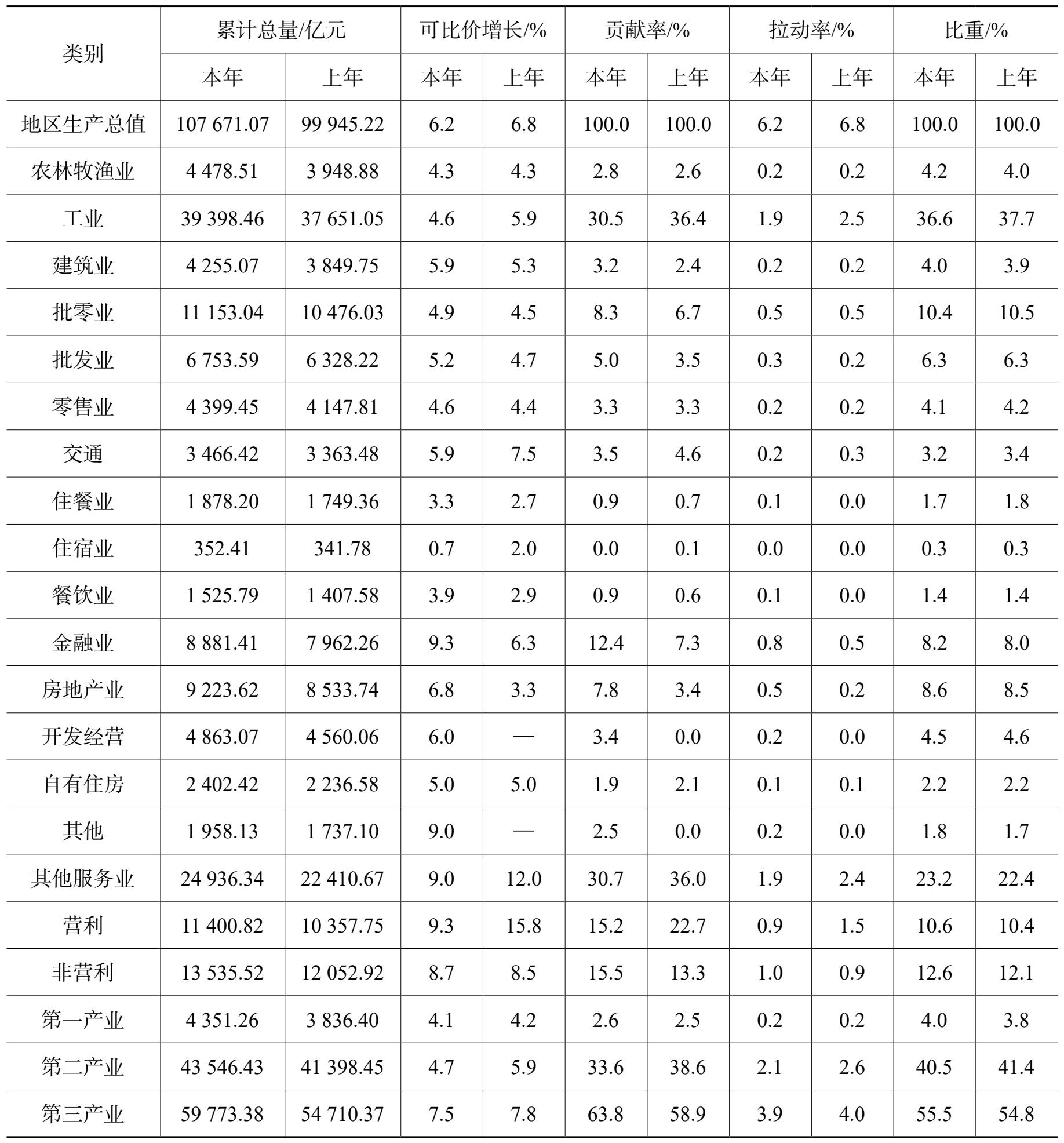 第三产业比重继续提升。第一产业、第二产业、第三产业增加值分别为4 351.26亿元、43 546.43亿元、59 773.38亿元,增长速度分别为4.1%、4.7%和7.5%。三次产业对经济增长的贡献率为2.6%、33.6%和63.8%,占地区生产总值比重调整为4.0%、40.5%和55.5%,其中第一产业比重提高了0.2个百分点,第二产业比重下降了0.9个百分点,第三产业比重提高了0.7个百分点。