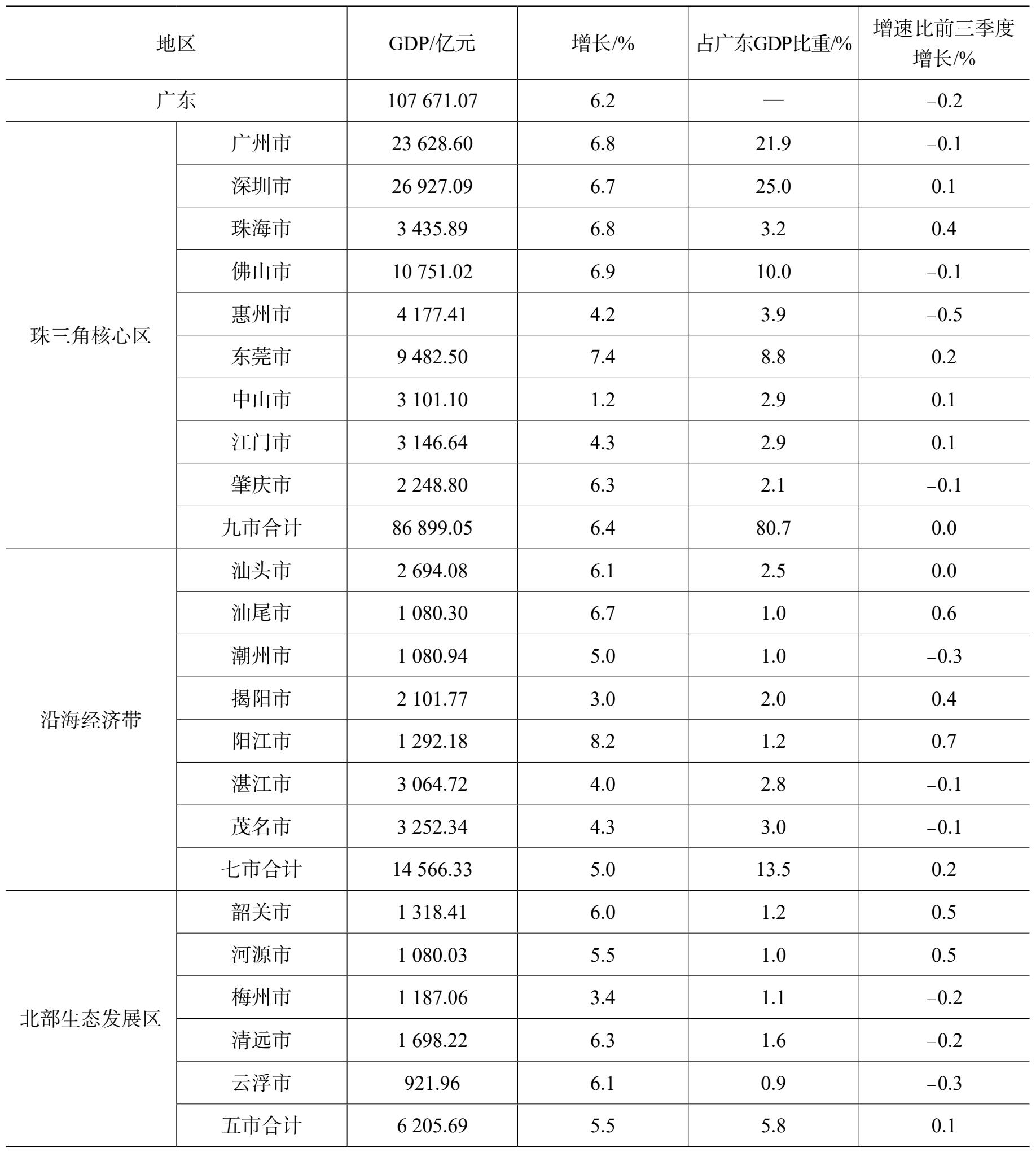 2019年,珠三角地区生产总值86 899.05亿元,增长6.4%,占全省比重80.7%;沿海经济带14 566.33亿元,增长5.0%;北部生态发展区6 205.69亿元,增长5.5%。从区域看,“一核一带一区”此消彼长共同撑起了广东经济增长(见表2)。