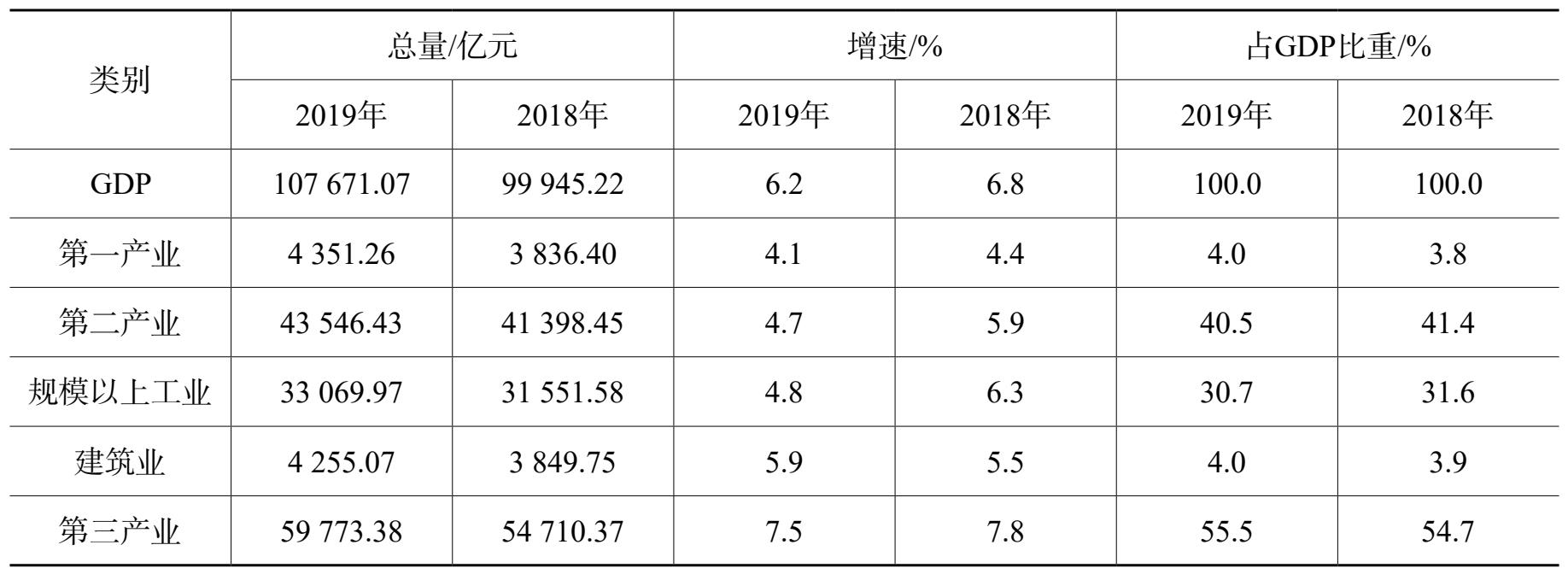 2019年,经国家统一核算,第一产业平稳向好,增加值实现增长4.1%,增幅比前三季度提高0.3个百分点;第二产业稳中略升,增长4.7%,比前三季度提高0.1个百分点;第三产业增长总体运行平稳,增长7.5%,比前三季度放缓0.4个百分点。三次产业比重为4.0∶40.5∶55.5,与前三季度相比,第二产业比重提高0.6个百分点,在“稳增长”中起到关键作用(见表13)。