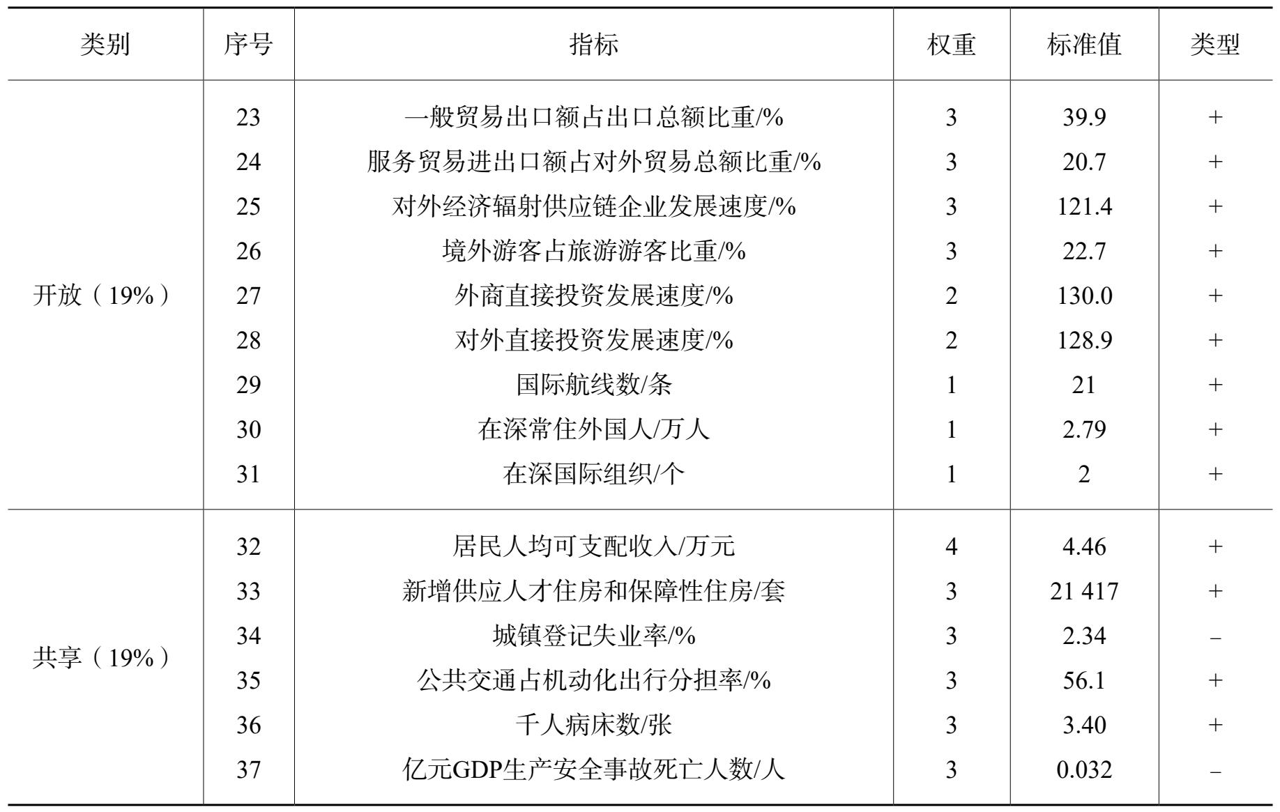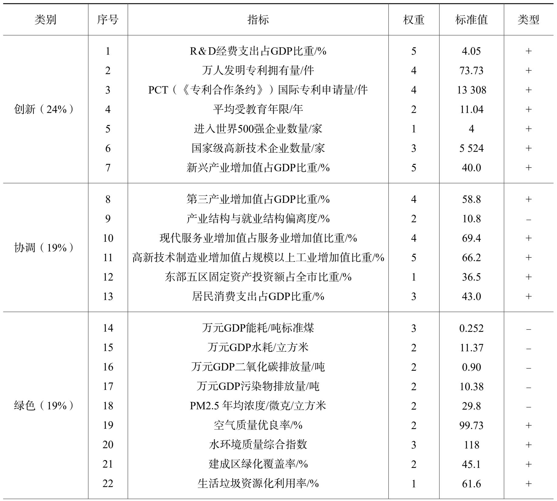 指标体系分“创新、协调、绿色、开放、共享”5个部分共设置37个指标,其中:创新部分共设置7个指标,考虑到创新是深圳的灵魂和发展主导战略,将权重定为24%;协调部分共设置6个指标,以反映产业之间、产业内部、产业与劳动力、区域发展、消费与GDP之间协调性,权重定为19%;绿色部分共设置9个指标,考虑到绿色是深圳今后的发展方向,权重定为19%;深圳开放时间较早、较彻底,故将开放部分设置9个指标,权重定为19%;共享是经济发展出发点和落脚点,共设置6个指标,权重为19%(见表1)。