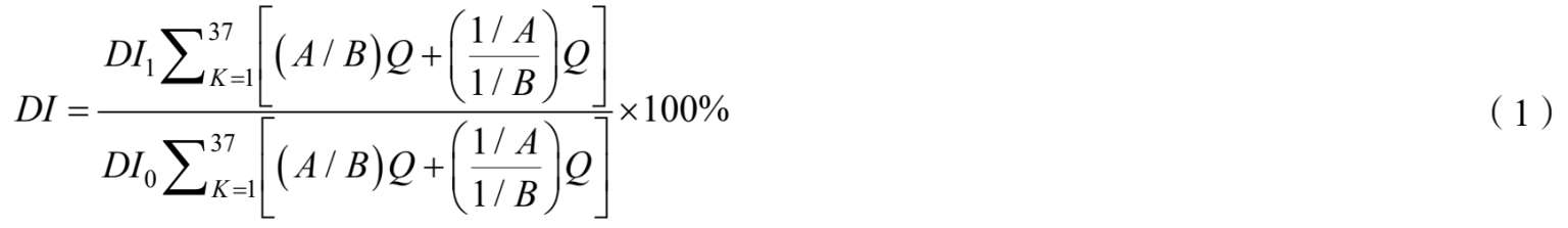 式(1)中: DI 代表总指数,反映落实“五大发展理念”的总体变化; DI 1 代表由37项指标构成的报告期总指数; DI 0 代表由37项指标构成的基期总指数; A 代表每项指标报告期实际值, B 代表基期标准值, Q 代表指标的权重;1/ A 、1/ B 代表逆向性指标。指标体系的逆向指标有产业结构与就业结构偏离度、万元GDP能耗、万元GDP水耗、万元GDP二氧化碳排放量、万元GDP污染物排放量、PM2.5年均浓度、城镇登记失业率、亿元GDP生产安全事故死亡人数等。