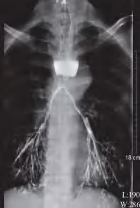 图1-3 超长食管癌患者癌肿侵穿支气管的食管造影表现