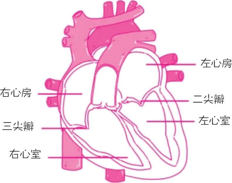 心脏包括左心房、左心室、右心房、右心室四个腔,心房和心室之间有瓣膜:左心室入口有二尖瓣,出口为主动脉瓣;右心室入口有三尖瓣,出口有肺动脉瓣。