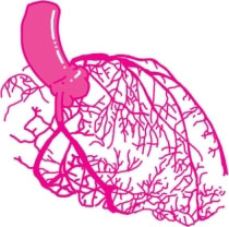 心脏从全身收集血液,通过肺部让静脉血变成动脉血后,再通过主动脉泵出去,而在主动脉开口处,则分出血管来供应心脏本身。这些血管就是覆盖在心脏表面的冠状动脉,它由三支粗大的血管(左前降支、左回旋支、右冠脉)和无数分支血管组成,包绕着整个心脏,给心脏本身供血、供氧。