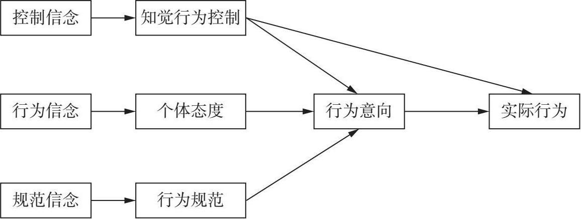 计划行为理论认为,个体的实际行为由其行为意向决定。行为意向是指一个人对未来行为的期望或计划。在行为计划理论模型中,行为意向并不是单一因素作用的结果,而是由个体态度、行为规范和知觉行为控制三个因素共同决定的。