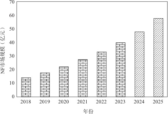 2013年以前,纳滤膜主要应用于苦咸水软化与脱盐;2013年以后,饮用水深度处理的纳滤膜应用呈蓬勃发展趋势。近年来,我国纳滤膜市场发展迅速,目前国外品牌在大型市政给水处理市场占据主导地位,我国本土膜企业产品主要应用在中小型项目。近年纳滤膜行业市场发展见图2-2。