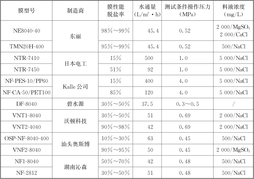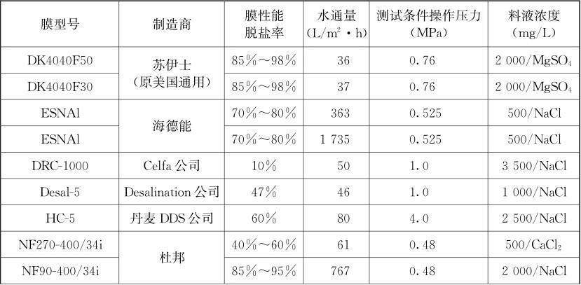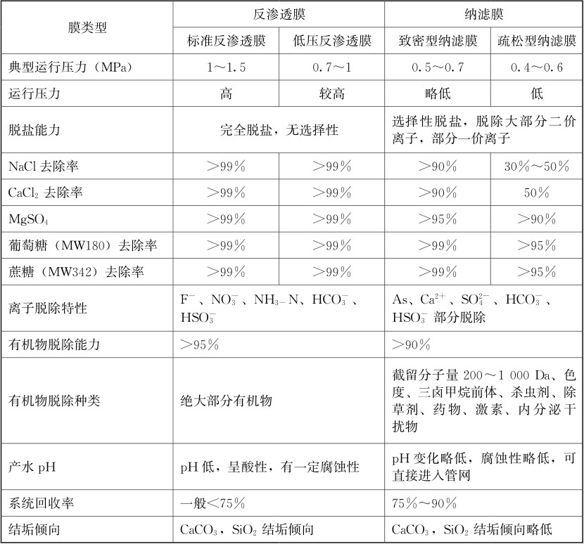 表2-1 反渗透膜与纳滤膜典型分离性能对比