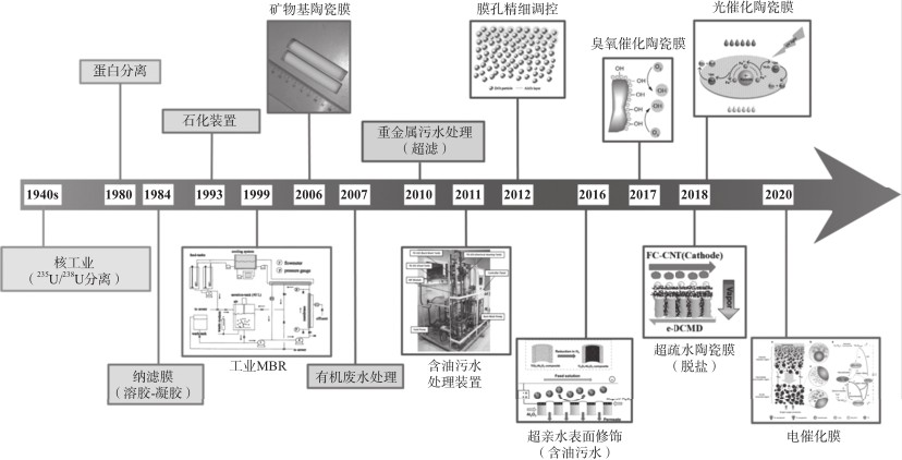 无机陶瓷膜的研究始于20世纪40年代,直到80年代,陶瓷膜在水处理、气体分离中的应用才越来越广泛。如今,陶瓷膜在环境、化学、石化、食品、生物、冶金等领域具有广泛的应用,尤其是在石油化工、化学工业等高温、高压、有机溶剂和强酸、强碱体系以及强化反应过程的膜催化、高温气体膜分离等方面呈现了有机膜所不具备的特性,成为苛性环境下精密分离的重要新技术。近年来,陶瓷膜因分离效率高、节能、耐热和结构稳定等突出优点,受到越来越多的关注与研究。陶瓷膜的发展及应用进程如图3-1所示。