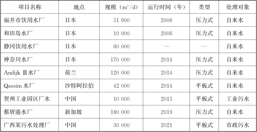 1996年在日本宫崎自来水厂首次将Metawater的陶瓷超滤膜应用于饮用水处理。时至今日,基于陶瓷膜的饮用水处理技术已经在日本和欧洲成功应用20多年。目前,日本是使用陶瓷膜饮用水处理最多的国家。截至2015年,全球建成的137座陶瓷膜自来水厂中有117座位于日本,代表性应用工程有:静冈60 000 m 3 /d自来水厂以及神奈川170 000 m 3 /d自来水厂(当时世界最大陶瓷膜生产饮用水厂)。2019年,新加坡建成了全球最大的陶瓷膜自来水厂,其供水规模为180 000 m 3 /d。目前,德国ITN、日本明电舍、美国sjerhombus、新加坡的世来福(ceraflo)等公司已经实现了无机平板膜MBR的商业化应用。日本明电舍于2010年开发陶瓷膜分离活性污泥法(MBR)成功后,迅速开拓亚太市场,2014年应用于新加坡JURONG岛工业园4 550 m 3 /d的工业废水处理,2015年应用于广西贺州工业园区废水,突破10 000 m 3 /d的处理规模。无机膜在全球大型水厂的应用见表3-6。目前中国山东工业陶瓷研究设计院有限公司也成功开发了水处理用中空平板陶瓷膜组件。