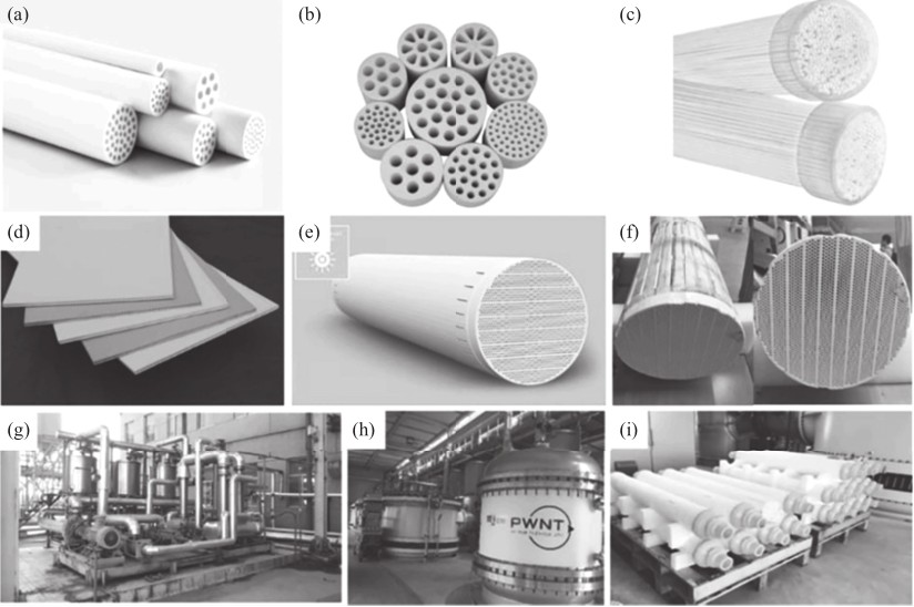 (a)管状陶瓷膜(中国江苏久吾高科技股份有限公司);(b)多通道管状陶瓷膜(中国国初科技有限公司);(c)中空纤维陶瓷膜(新加坡Hyflux有限公司);(d)平板陶瓷膜(山东工业陶瓷研究设计院有限公司);(e)蜂窝结构亚纳米陶瓷膜(日本NGK Insulatros);(f)大型壳体内陶瓷膜的蜂窝排列结构(CeraMac ǀ,PWNT,荷兰);(g)陶瓷超滤膜处理含油废水现场装置照片(中国石化胜利油田化工总厂);(h)AndijkⅢ水处理厂(荷兰)的照片;(i)陶瓷膜元件