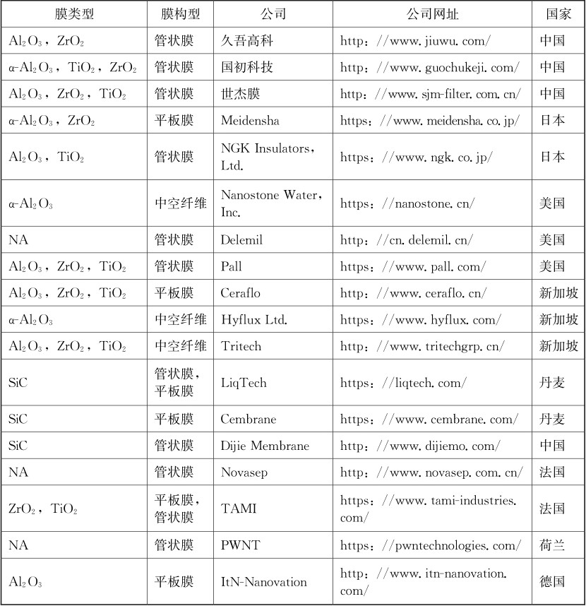 表3-4 具有代表性的商业陶瓷膜的膜类型及膜构型