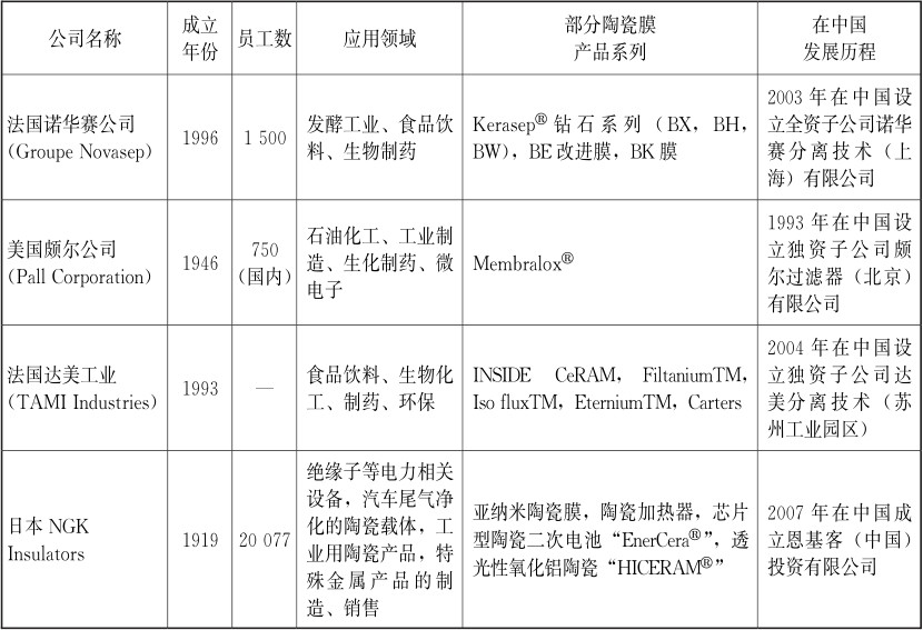 全球目前从事陶瓷膜业务的规模化企业相对较少,多数企业的业务范围仅限于采购陶瓷膜材料及组件进行成套设备加工和工程安装,仅少数企业具备自主研发、设计、生产陶瓷膜材料、膜组件与成套设备并以此为基础向客户提供膜集成技术整体解决方案的完整业务体系。中国的久吾高科、法国诺华赛公司、美国颇尔公司、法国达美工业公司、德国Inopor、日本的NGK Insulators是其中的佼佼者。全球四大无机膜生产企业概况见表3-5。