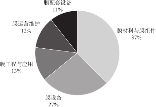 根据产业链的分类,我国膜企业主营业务可分为三大类:(1)膜生产环节的膜材料与膜组件、膜设备;(2)膜应用环节的膜工程与应用;(3)膜运营维护环节与配套服务等。根据不完全统计数据,从事膜材料与膜组件生产、销售业务的膜企业占比高达37%。这说明我国的膜产业已经建立了膜材料的开发与供应链,以及膜组件生产加工和销售链,为膜技术的应用提供了重要保障。其次,从事膜设备(27%)、膜工程与应用(13%)相关业务的企业数量紧随其后,说明我国膜产业的应用领域也在不断扩大。从事膜运营维护与膜配套设备业务的企业占比也达到12% 和11%(见图1-7)。这些数据反映我国膜产业的发展已经形成了完整的产业链,形成了水处理用膜、特种分离膜、气体分离膜、能源用膜、医用膜和特种功能膜等多种膜产品并重的发展趋势,涵盖了膜材料的研发与生产、膜组件的加工与销售、膜设备的制造与应用,以及膜工程与工程的设计与施工。同时,配套的运营维护服务也日益受到重视,这为膜技术的长期稳定运行提供了保障。
