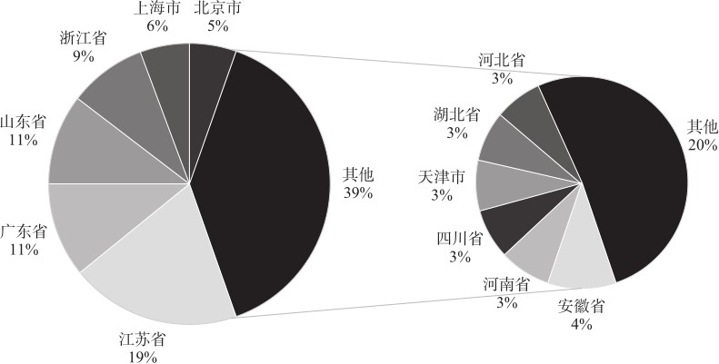 膜企业作为产业的核心,不仅推动了膜技术在中国的发展,还为整个产业链带来了丰富的商机和良好的发展机遇。根据中国膜工业协会注册会员名单,并综合北京膜展(第1~23届中国国际膜与水处理技术及装备展览会)、上海膜展(2008—2021年AQUATECH CHINA上海国际水展)、广东膜展(广东国际水处理技术与设备展览会与广州国际水展,2018合并为GDWater广东水展)的参展商名录以及相关数据库。据不完全统计,截至2022年底,国内有5035家规模以上的企业从事与膜材料/组件、膜装备与膜工程相关的业务。这些企业主要分布在中国的经济重要地区,集中在京津冀、长江三角洲和珠江三角洲地区。其中,江苏省以19%的占比占据首位,广东和山东分别以11%的占比紧随其后,浙江与上海分别有9%与6%的份额,北京占5%。这六个地区的膜企业总数合计占据了整个膜行业的60%以上份额,如图1-6所示。
