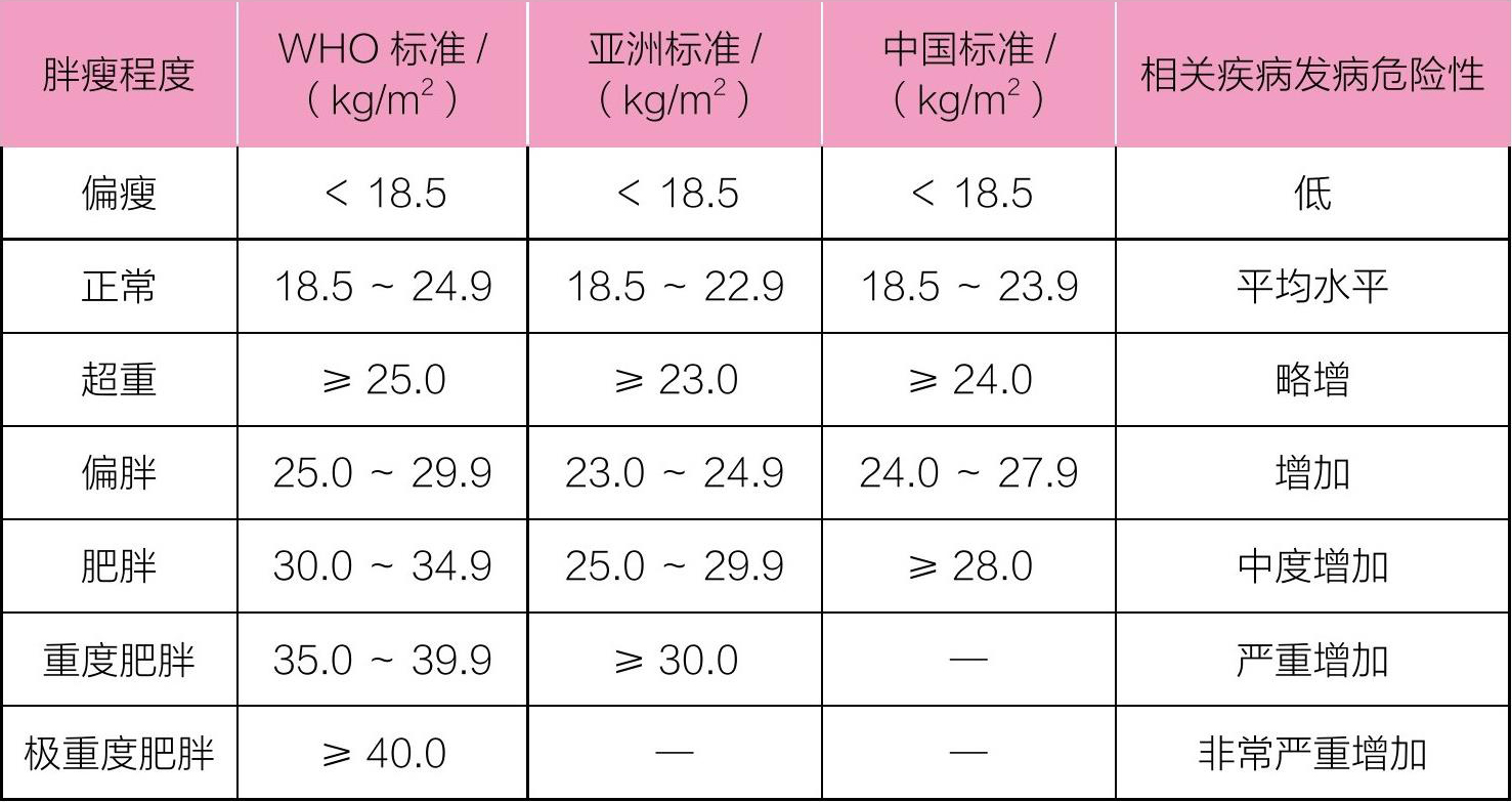 备孕期间是需要进行体重管理的,要避免肥胖。肥胖容易诱发高血压、高脂血症、糖尿病,更重要的是会影响受孕,引起内分泌失调,会干扰女性的月经周期和排卵,从而影响受孕。体重指数[体重(kg)/身高 2 (m)]在18.5~23.9kg/m 2 内属正常(表1-1)。科学地控制体重,合理饮食,营养均衡对身体健康是非常重要的。