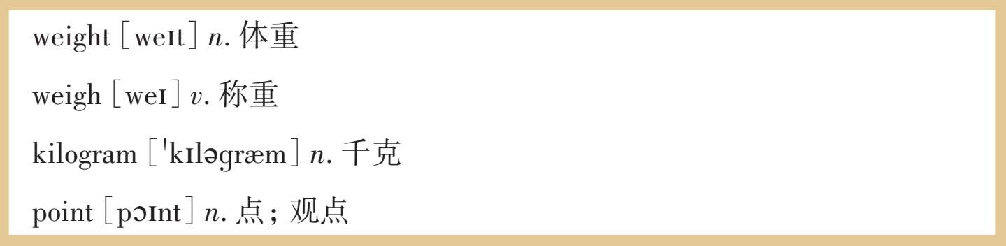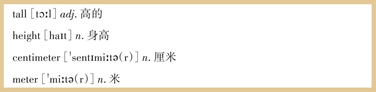 2.表达身高、体重的单位:厘米、米、千克。注意: centimeter 和 meter 存在进制关系,口语表达中必须使用单词复数形式的发音,不能直接说 cm , m , kg 。切忌慌张,将单位说错闹笑话。
