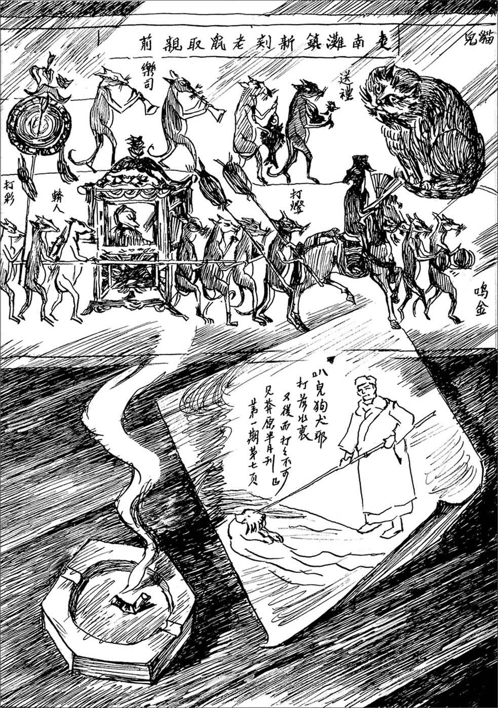 几百年的老屋中的豆油灯的微光下,是老鼠跳梁的世界,飘忽地走着,吱吱地叫着,那态度往往比“名人名教授”还轩昂。猫是饲养着的,然而吃饭不管事。祖母她们虽然常恨鼠子们啮破了箱柜,偷吃了东西,我却以为这也算不得什么大罪,也和我不相干,况且这类坏事大概是大个子的老鼠做的,决不能诬陷到我所爱的小鼠身上去。这类小鼠大抵在地上走动,只有拇指那么大,也不很畏惧人,我们那里叫它“隐鼠”,与专住在屋上的伟大者是两种。我的床前就帖着两张花纸,一是“八戒招赘” [20] ,满纸长嘴大耳,我以为不甚雅观;别的一张“老鼠成亲” [21] 却可爱,自新郎新妇以至傧相,宾客,执事,没有一个不是尖腮细腿,像煞读书人的,但穿的都是红衫绿裤。我想,能举办这样大仪式的,一定只有我所喜欢的那些隐鼠。现在是粗俗了,在路上遇见人类的迎娶仪仗,也不过当作性交的广告看,不甚留心;但那时的想看“老鼠成亲”的仪式,却极其神往,即使像海昌蒋氏似的连拜三夜,怕也未必会看得心烦。正月十四的夜,是我不肯轻易便睡,等候它们的仪仗从床下出来的夜。然而仍然只看见几个光着身子的隐鼠在地面游行,不像正在办着喜事。直到我熬不住了,怏怏睡去,一睁眼却已经天明,到了灯节了。也许鼠族的婚仪,不但不分请帖,来收罗贺礼,虽是真的“观礼”,也绝对不欢迎的罢,我想,这是它们向来的习惯,无法抗议的。
