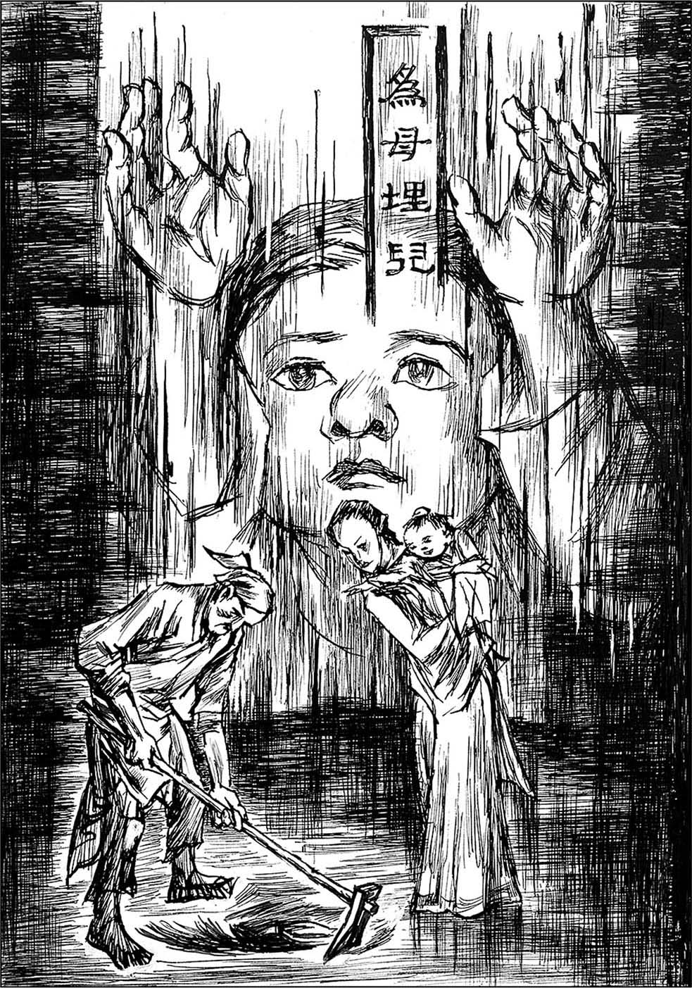 至于玩着“摇咕咚”的郭巨的儿子,却实在值得同情。他被抱在他母亲的臂膊上,高高兴兴地笑着;他的父亲却正在掘窟窿,要将他埋掉了。说明云,“汉郭巨家贫,有子三岁,母尝减食与之。巨谓妻曰,贫乏不能供母,子又分母之食。盍埋此子?”但是刘向 [29] 《孝子传》所说,却又有些不同:巨家是富的,他都给了两弟;孩子是才生的,并没有到三岁。结末又大略相像了,“及掘坑二尺,得黄金一釜,上云:天赐郭巨,官不得取,民不得夺!”
