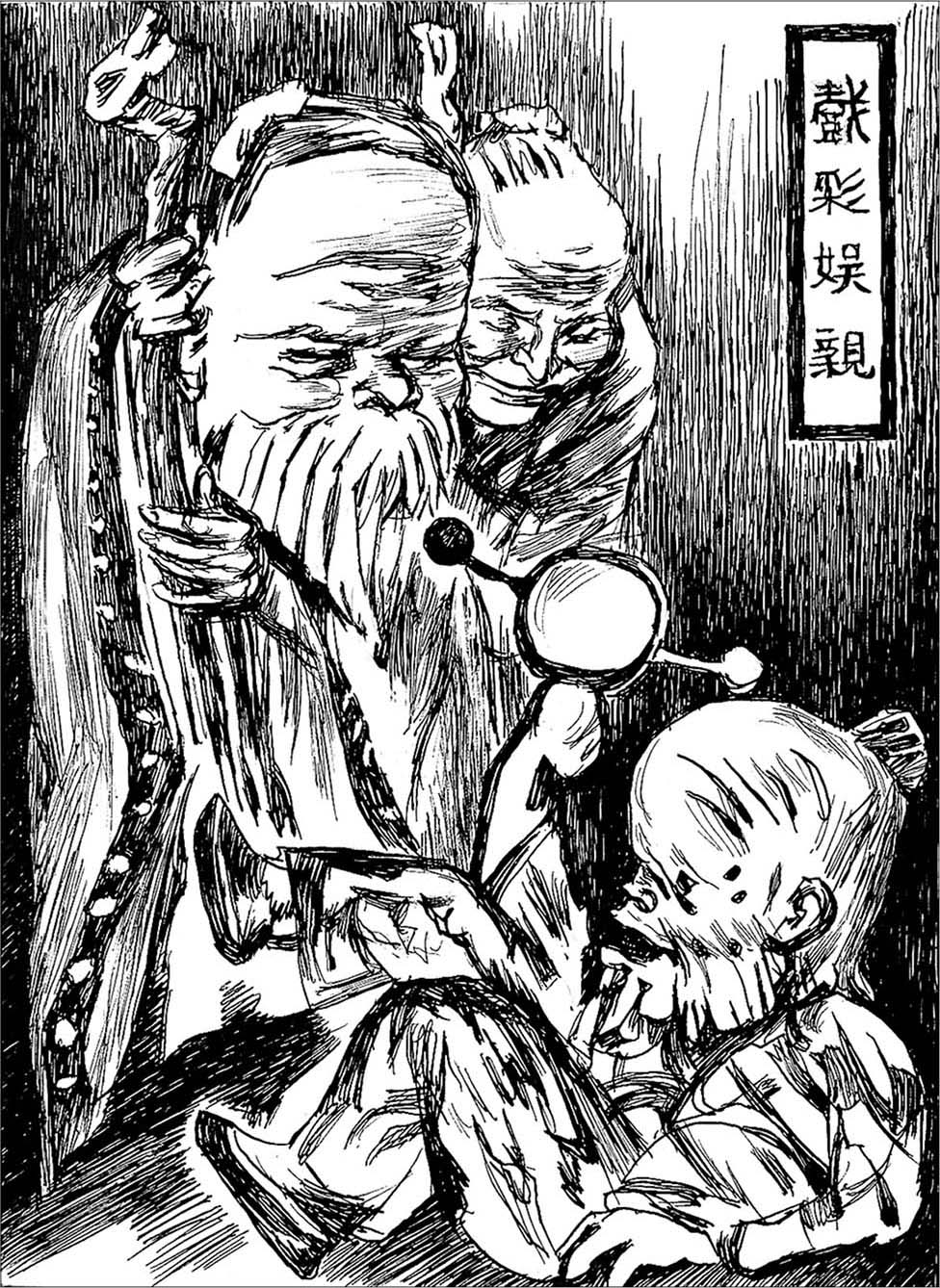 那时的《二十四孝图》,早已不知去向了,目下所有的只是一本日本小田海僊 [23] 所画的本子,叙老莱子事云,“行年七十,言不称老,常著五色斑斓之衣,为婴儿戏于亲侧。又常取水上堂,诈跌仆地,作婴儿啼,以娱亲意。”大约旧本也差不多,而招我反感的便是“诈跌”。无论忤逆,无论孝顺,小孩子多不愿意“诈”作,听故事也不喜欢是谣言,这是凡有稍稍留心儿童心理的都知道的。