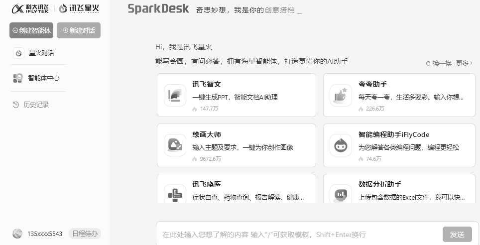 用于打开智能体中心,即讯飞星火的功能集合;“历史记录”按钮