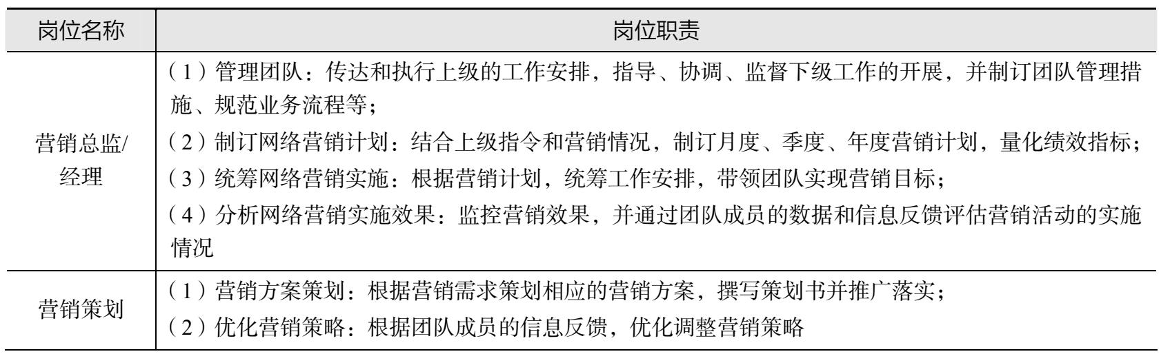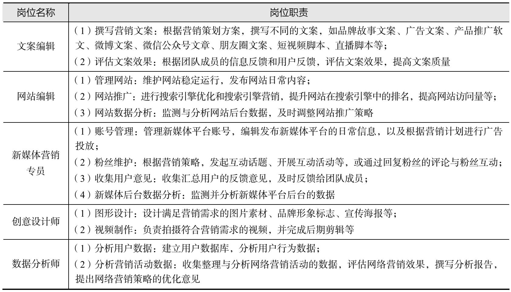 企业要想持续地取得良好的网络营销效果,需要进行长远的谋划并制订有效的营销方案和策略,而这一切的实现依赖于专业的网络营销团队。网络营销团队涉及的主要岗位及其职责如表1-3所示。